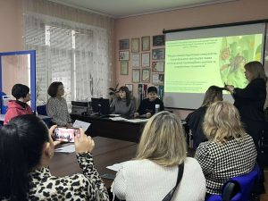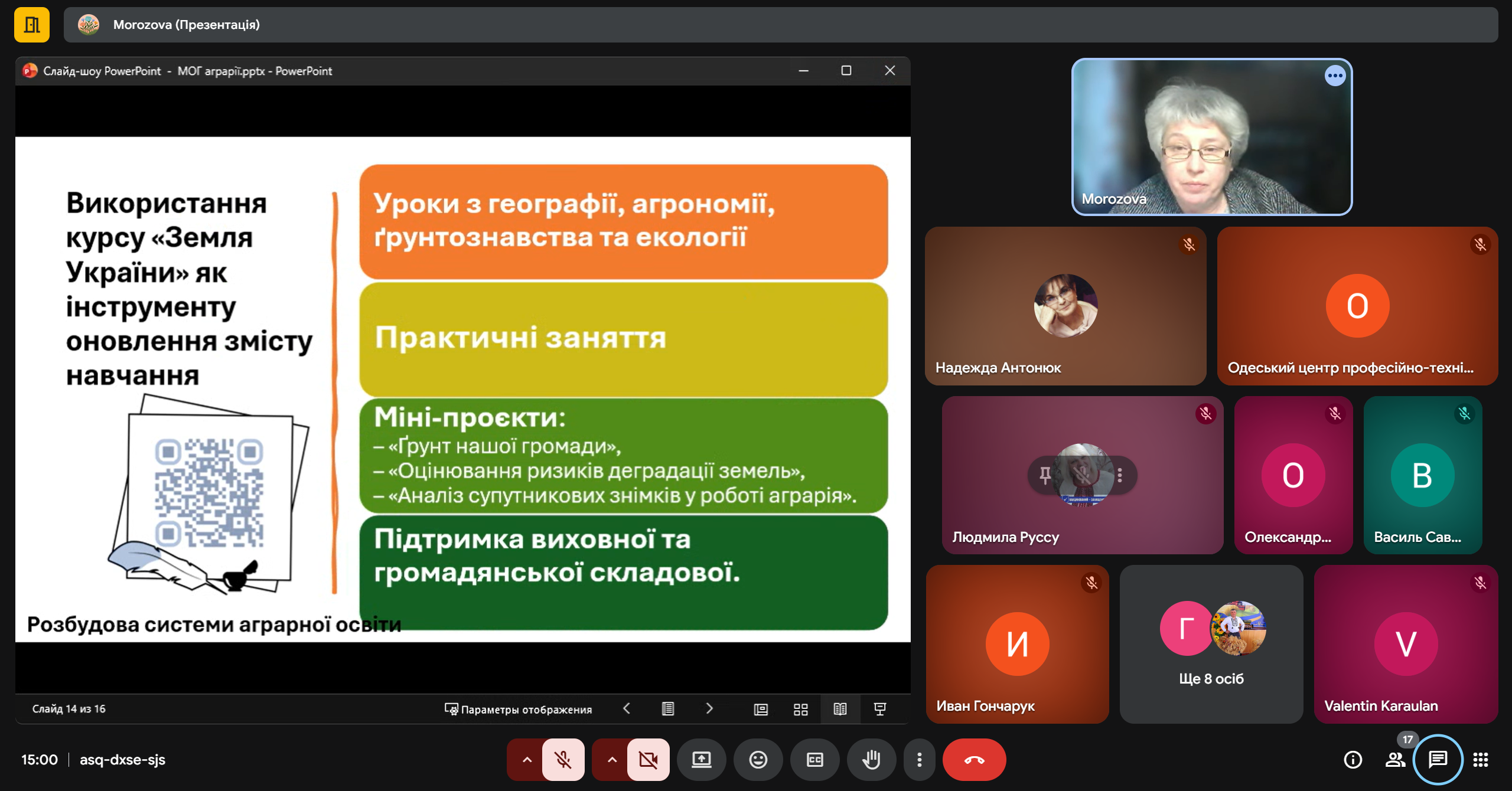 Олена Григорівна Морозова, методист НМЦ ПТО поділилася важливими інсайтами, отриманими на національних професійних заходах — зокрема, на форумах «Майбутнє профосвіти в реаліях війни та миру», «Розбудова системи аграрної освіти на рівні закладів загальної середньої та професійної освіти» та освітньому форумі «Агро єднає». Вона підкреслила важливість розвитку кваліфікаційних центрів, інтеграції професійної освіти з громадами та посилення цифровізації в аграрній підготовці. Олена Григорівна коротко презентувала можливості використання навчального курсу «Земля України» у підготовці здобувачів аграрних професій. Було підкреслено, що ресурс містить сучасні карти, аналітичні матеріали, дані про ґрунти та кліматичні зони, які можна інтегрувати в уроки загальноосвітніх та спеціальних предметів.