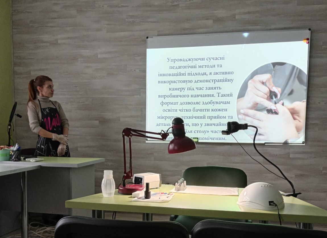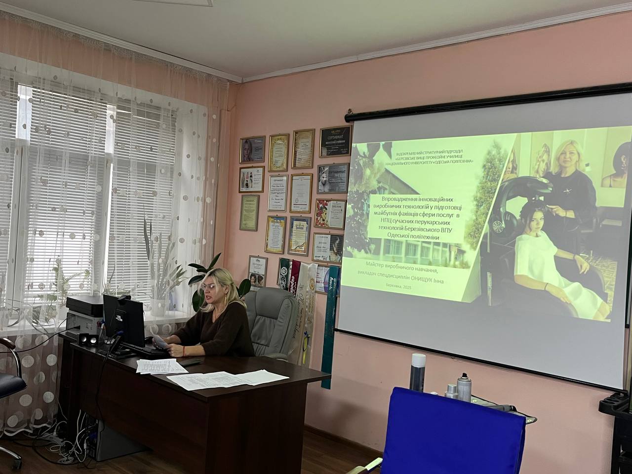 Онищук Інна Миколаївна, викладач спецдисциплін, майстер виробничого навчання ВСП «Березівське вище професійне училище Національного  університету «Одеська політехніка» розповіла, як застосовуються інноваційні педагогічні та виробничі технології у підготовці спеціалістів сфери послуг на базі НПЦ. Пріоритетними завданнями  нового навчально-практичного центру інноваційних перукарських технологій  як сучасного  освітнього осередку, визначено підготовку кваліфікованих робітників відповідно до  зростаючих  потреб галузі,  технологічних та  ментальних викликів, які обумовлені глобалізацією, технологізацією і цифровізацією економіки. У НПЦ створено можливості не лише  інноваційного навчання професійним  перукарським  послугам та якісному сервісу, а й  комфортні умови,  приємна   атмосфера,   сучасний дизайн з гармонією кольорів та ергономікою приміщення.