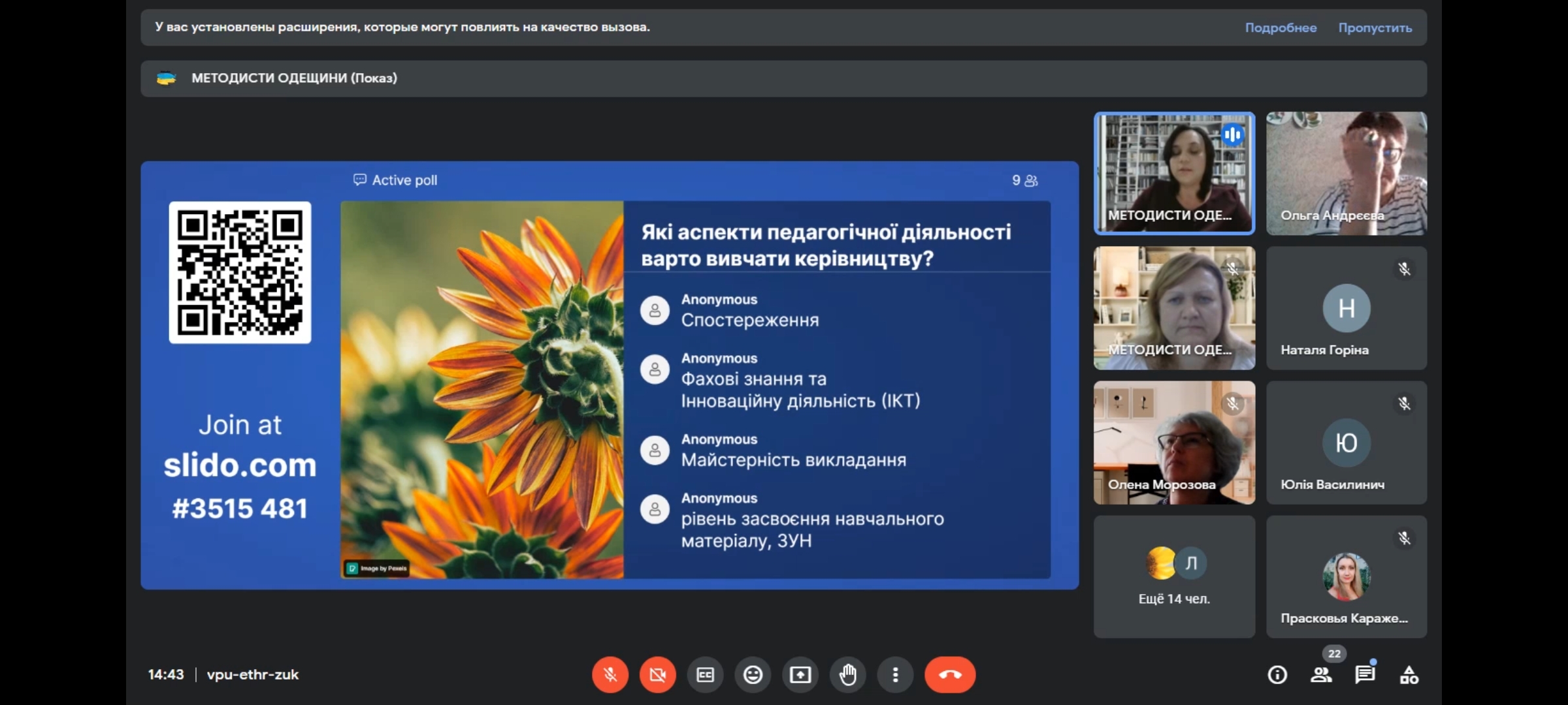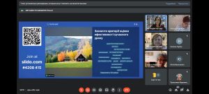 У ході засідання учасники виконували завдання в додатку Slido. Обміркували критерії оцінки ефективності сучасного уроку, а також які аспекти педагогічної діяльності варто вивчати керівництву.
