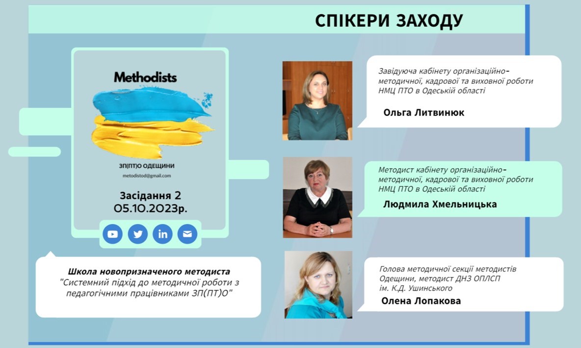 Спікери заходу: Ольга Литвинюк, завідуюча кабінету організаційно-методичної, кадрової та виховної роботи НМЦ ПТО в Одеській області, Людмила Хмельницька, методист кабінету організаційно-методичної, кадрової та виховної роботи НМЦ ПТО в Одеській області, Олена Лопакова, голова методичного об’єднання методистів Одеської області, методист ДНЗ «Одеський професійний ліцей сфери послуг Південноукраїнського національного педагогічного університету імені К.Д. Ушинського».