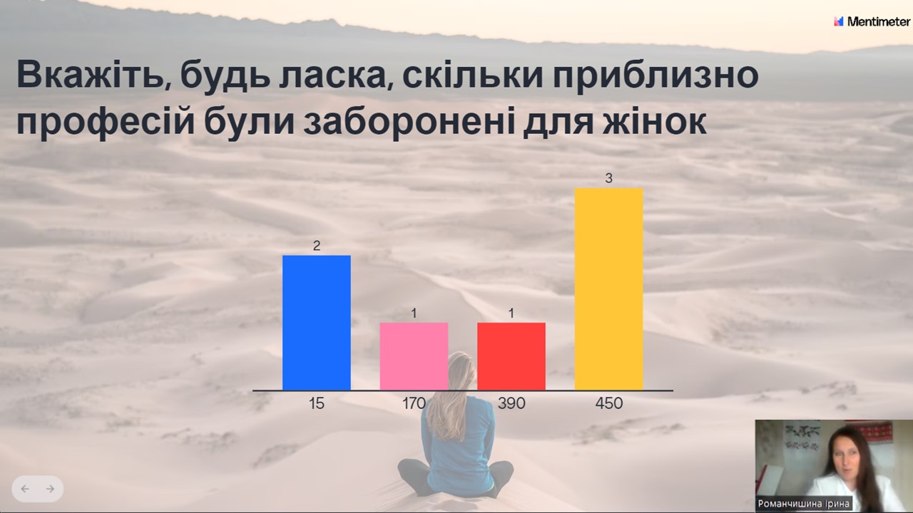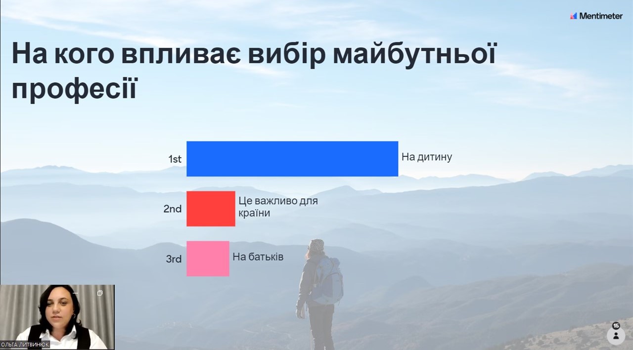 Продовжила івент у формі дискусійного воркшопу на тему: «Беремо участь – беремо відповідальність: професії, які наближають нашу перемогу» – Гриньова Марія – методистка науково-методичної лабораторії управлінської діяльності та забезпечення якості освіти кафедри педагогіки та освітнього менеджменту Одеської академія неперервної освіти Одеської обласної ради, тренерка з освіти для демократичного громадянства та світи з прав людини. Протягом воркшопу було проведено низку інтерактивних вправ, яку присутні з величезним задоволенням виконували, обговорювали і ділилися яскравими емоціями.