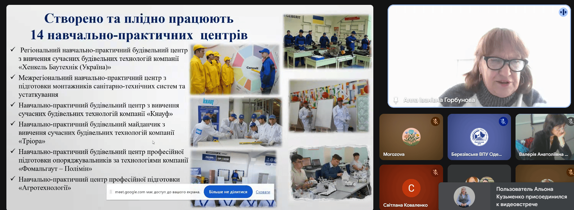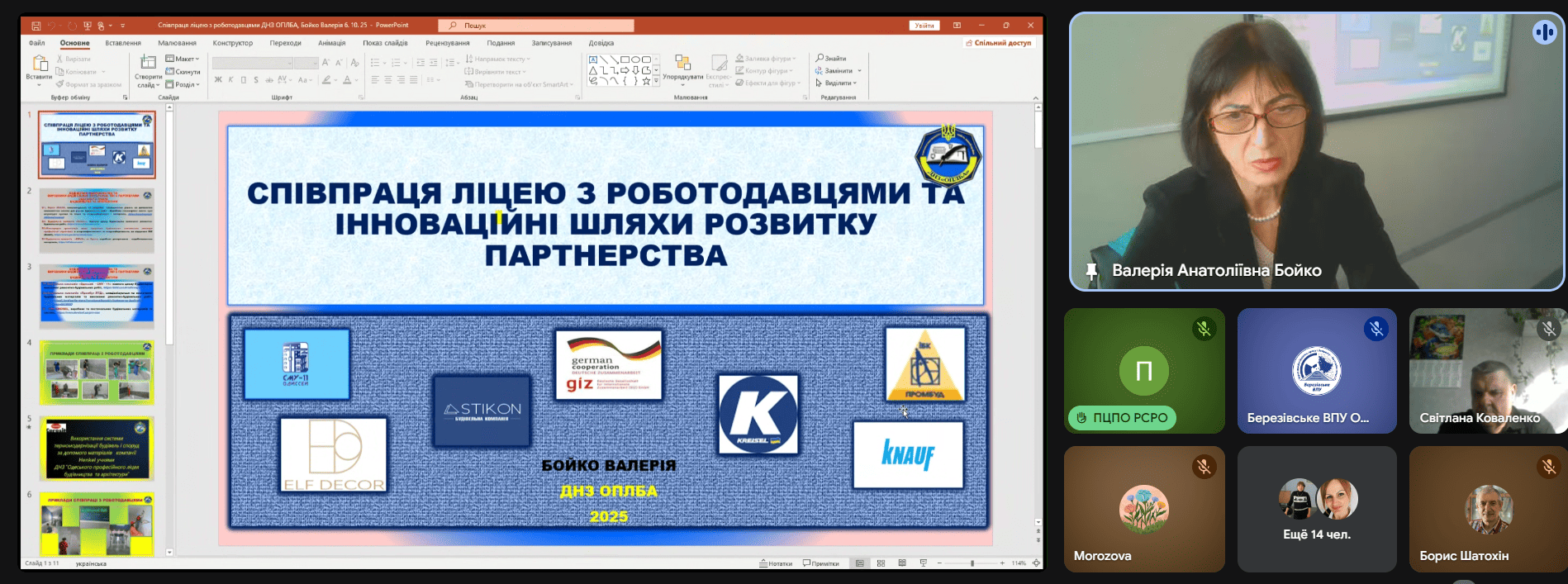 Олена Григорівна Морозова, методист НМЦ ПТО поділилася важливими інсайтами, отриманими на національних професійних заходах — зокрема, на форумах «Майбутнє профосвіти в реаліях війни та миру», «Розбудова системи аграрної освіти на рівні закладів загальної середньої та професійної освіти» та освітньому форумі «Агро єднає». Вона підкреслила важливість розвитку кваліфікаційних центрів, інтеграції професійної освіти з громадами та посилення цифровізації в аграрній підготовці. Олена Григорівна коротко презентувала можливості використання навчального курсу «Земля України» у підготовці здобувачів аграрних професій. Було підкреслено, що ресурс містить сучасні карти, аналітичні матеріали, дані про ґрунти та кліматичні зони, які можна інтегрувати в уроки загальноосвітніх та спеціальних предметів.