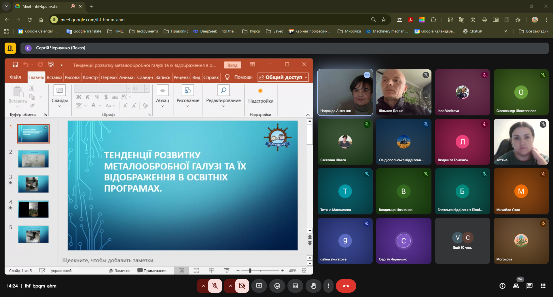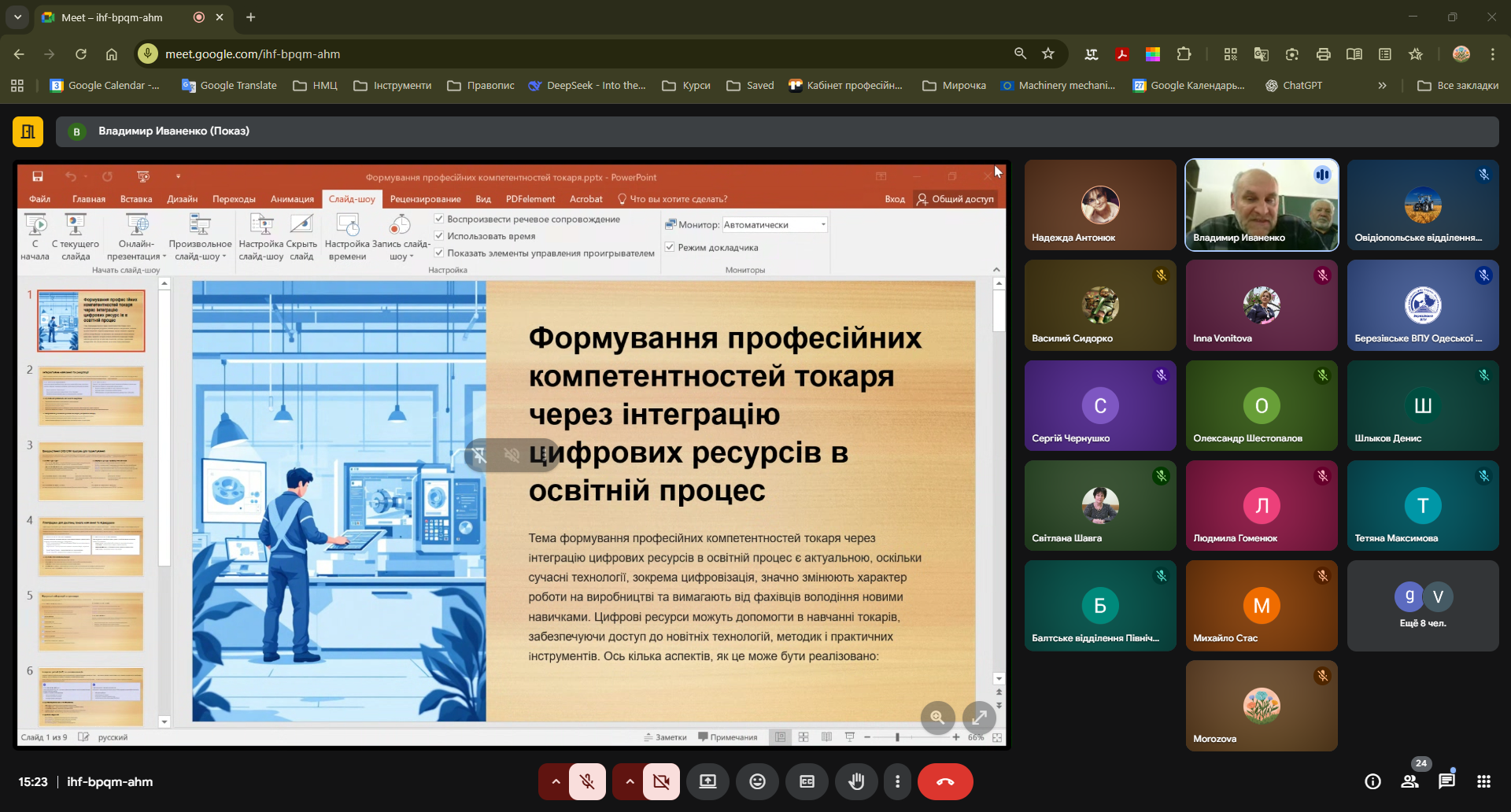 Після розгляду педагогічних аспектів секція перейшла до цифрових інновацій. Валентин Іванович Караулан, викладач спецпредметів ЗП(ПТ)О «Дунайський центр професійної освіти» продемонстрував приклади застосування ШІ для створення навчальних матеріалів, тестів, інфографіки й аудіо- та відеоматеріалів. Він переконливо показав, як використання Gemini та NotebookLM допомагає автоматизувати підготовку до занять і посилює інноваційність методичної роботи.