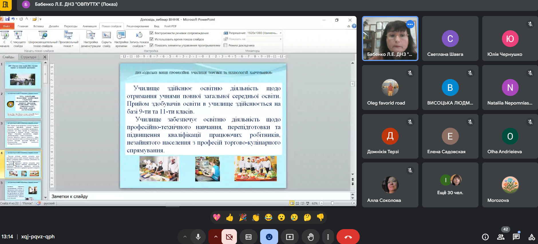 Олена Морозова, методист НМЦ ПТО в Одеській області, відкрила вебінар, привітавши учасників та окресливши основні напрями обговорення формування професійних компетентностей здобувачів освіти в аграрному секторі, які набувають стратегічного значення, тому що саме аграрна галузь є однією з ключових для економіки України. Крім того, у сучасних умовах глобалізації та швидкого розвитку технологій професійна підготовка кваліфікованих працівників повинна відповідати не лише вимогам часу, але й передбачати майбутні виклики.