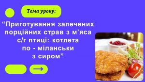 До вашої уваги методична розробка уроку виробничого навчання з професії “Кухар” 4 розряду. Тема уроку: “Приготування запечених порцій страв з м’яса с/г птиці: котлета по-міланськи з сиром”. (майстер виробничого навчання Мілєва О.В. ДНЗ “Ананьївський ПАЛ”)