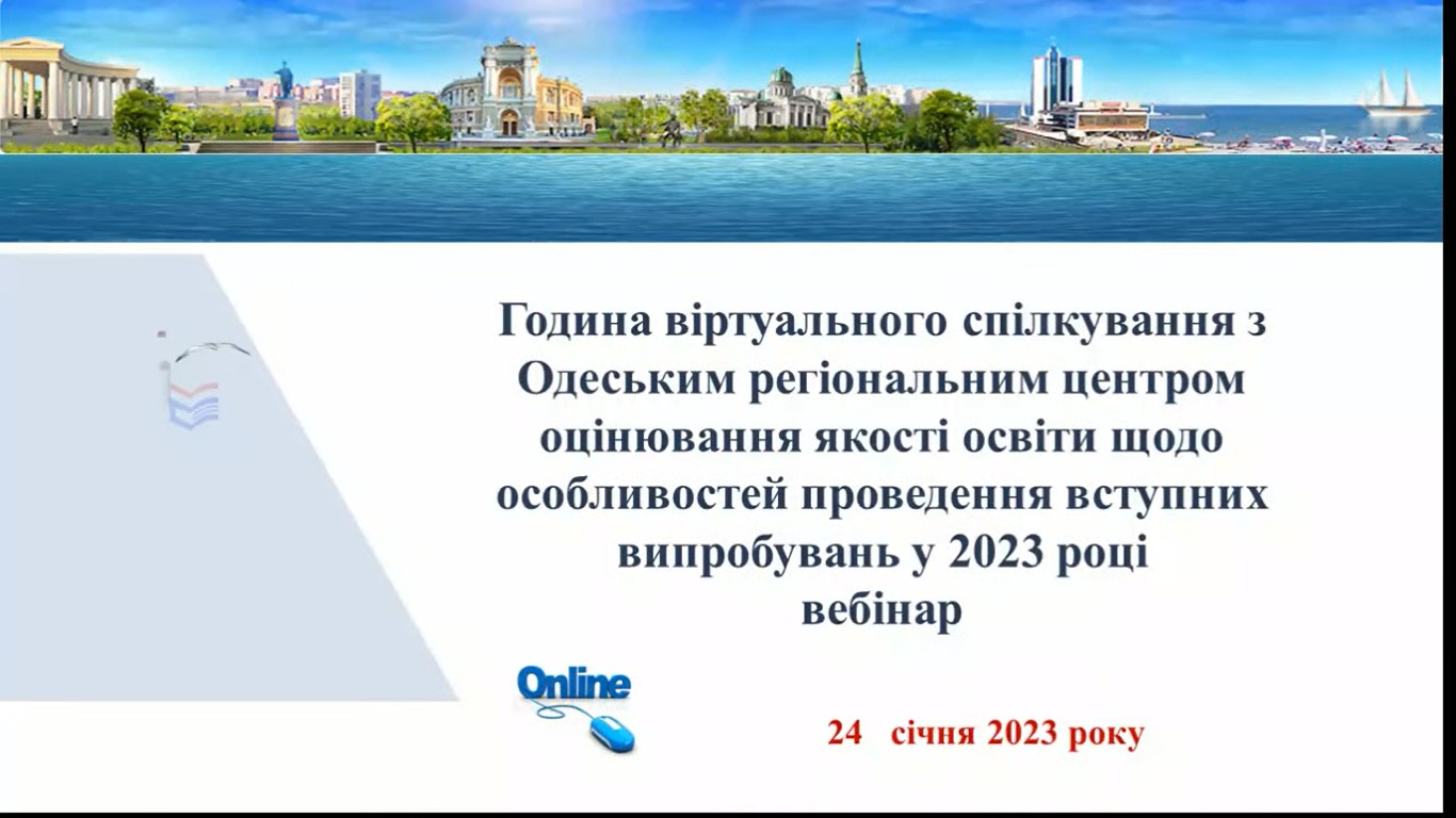 30 січня 2024 року методисти НМЦ ПТО в Одеській області та викладачі української мови, української літератури та англійської мови закладів професійної (професійно-технічної) освіти долучилися до участі у вебінарі «Година віртуального спілкування з Одеським регіональним центром оцінювання якості освіти» щодо підготовки до складання у 2024 році української мови як обов’язкового предмета НМТ, української літератури та іноземних мов (на прикладі англійської мови) як предметів НМТ на вибір.