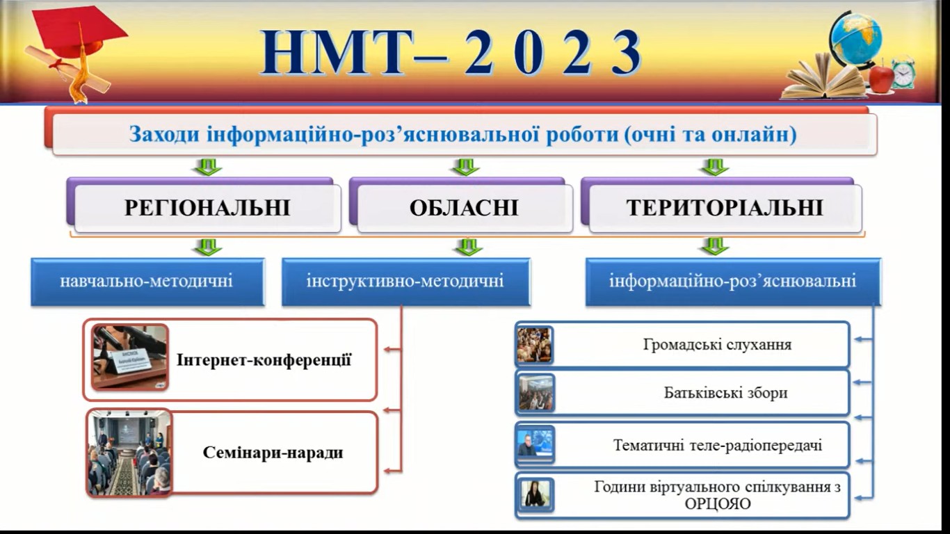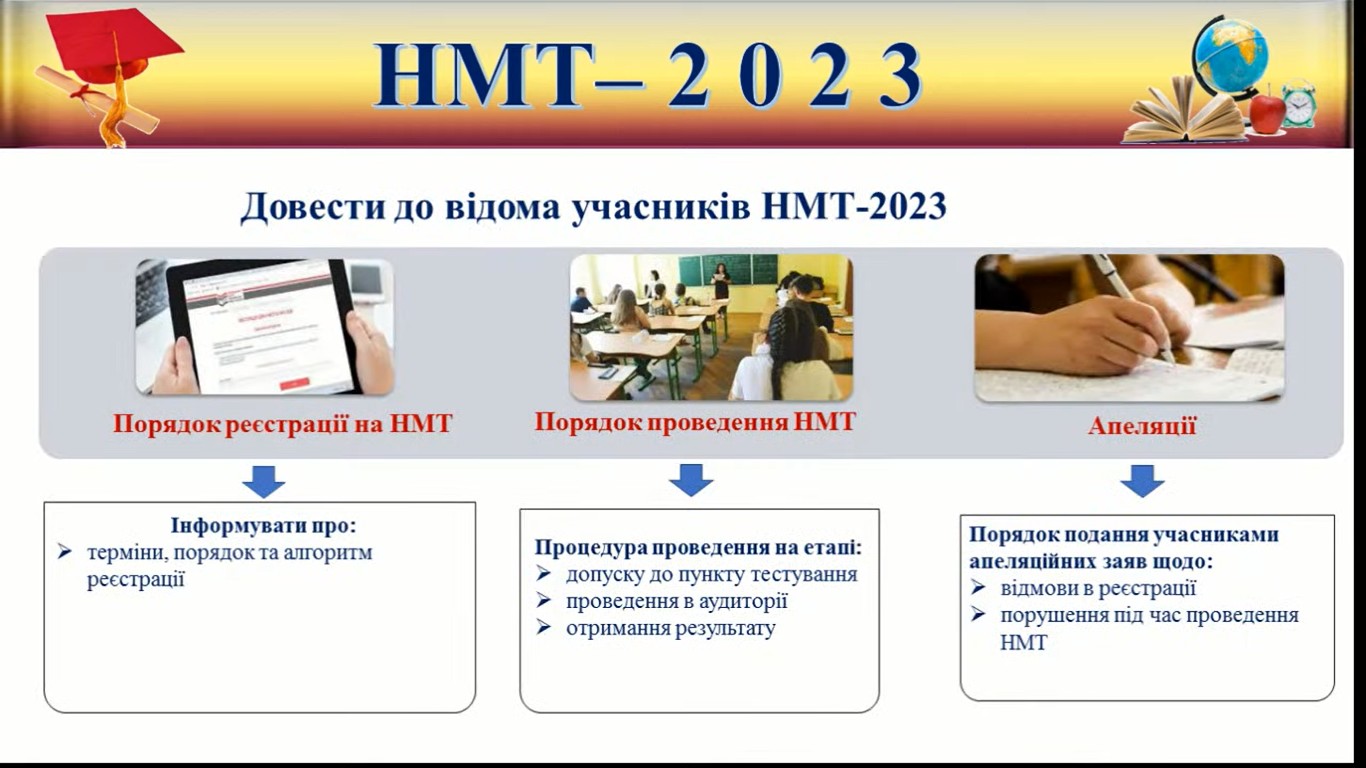 Під час зустрічі представники ОРЦОЯО розкрили низку питань, пов`язаних з особливостями проведення цьогорічного тестування, ознайомили з організацією та графіком сесій проведення НМТ у 2024 році, повідомили про загальні характеристики предметних тестів та схеми нарахування балів за виконання їх завдань, а також охарактеризували кількість і форми тестових завдань із кожного предмета та час на їх виконання.
