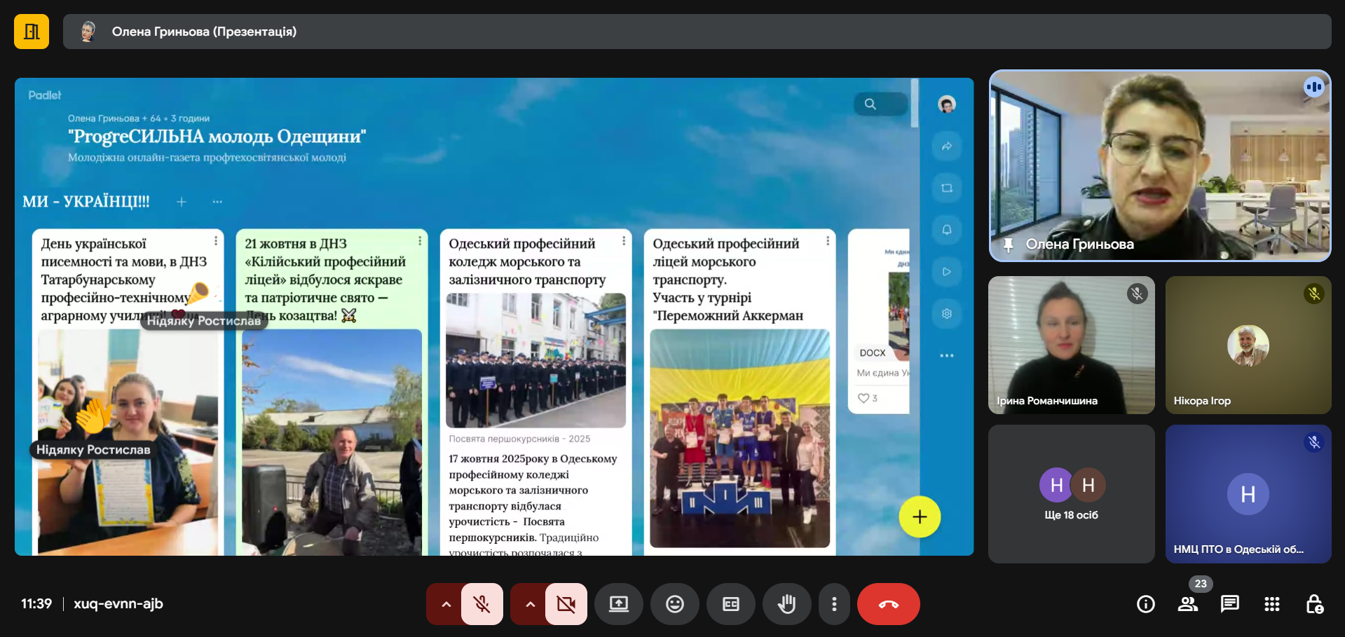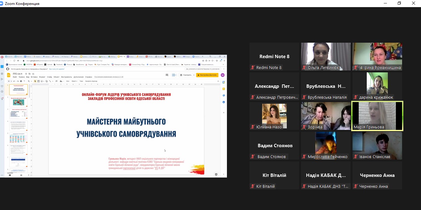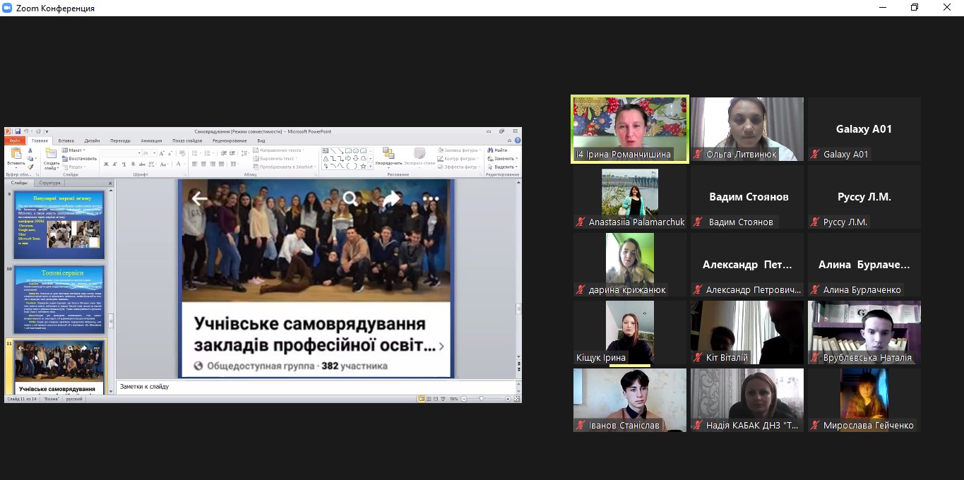 З метою зміцнення співпраці між НМЦ ПТО в Одеській області та лідерами ЗПО, обміну досвідом і творчими напрацюваннями, Олена ГРИНЬОВА, викладачка української мови та літератури ДНЗ «Одеський професійний ліцей сфери послуг ПНПУ ім. К. Д. Ушинського», ознайомила учасників із діяльністю групи «Учнівське самоврядування ЗПО Одещини» у соціальній мережі Facebook та молодіжною газетою «ProgreСИЛЬНА молодь Одещини».