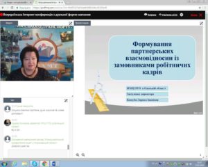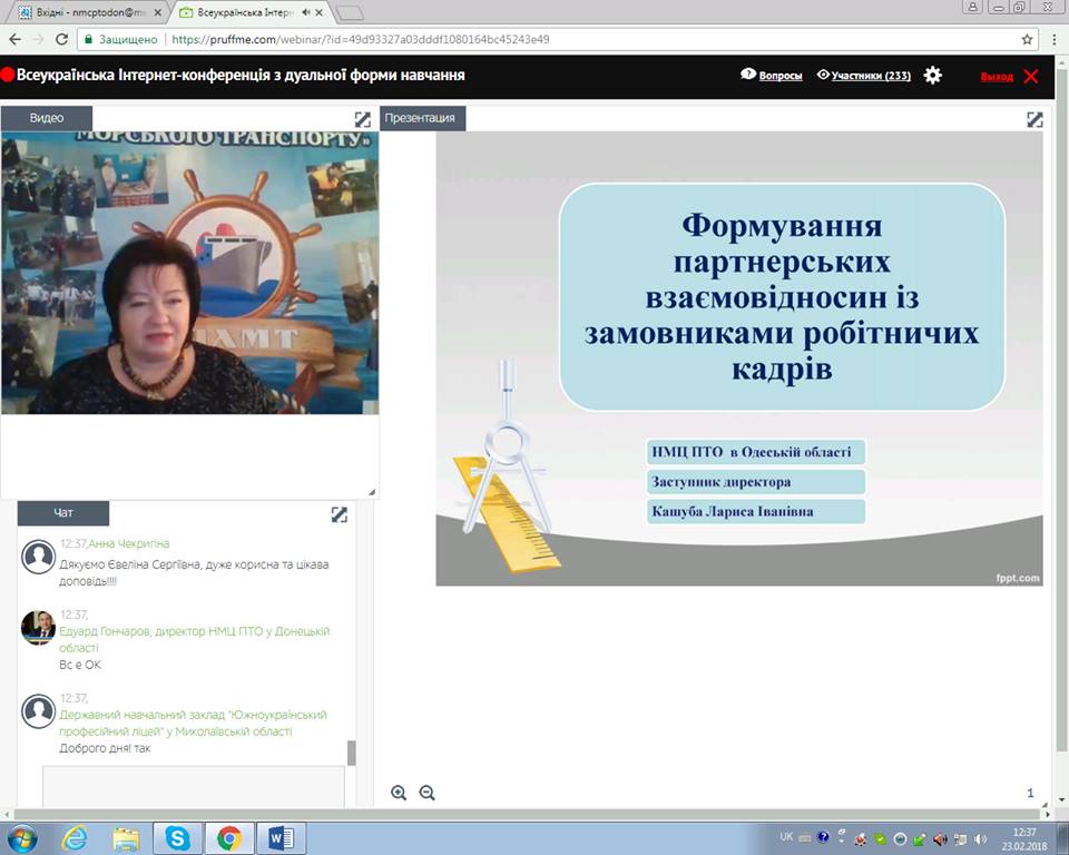 Питання формування партнерських взаємовідносин із замовниками робітничих кадрів висвітлила заступник директора Навчально-методичного центру професійно-технічної освіти в Одеській області Кашуба Лариса Іванівна та окремо зупинилась на проблемах з які виникають при впровадженні дуальної форми навчання у підготовку робітничих кадрів, а саме: недостатньо уваги приділено мотивації роботодавців (податкові пільги, дотації, компенсації тощо) для сприяння організації і проведення ними на своїх базах різних видів навчально-виробничої діяльності, підвищення кваліфікації та стажування педагогічних працівників закладів професійної (професійно-технічної) освіти, недостатнє усвідомлення роботодавцями важливості і перспективності дуальної освіти, відсутність на підприємствах механізму оплати праці учнів – практикантів, стимулювання оплати керівникам практики, наставникам.
