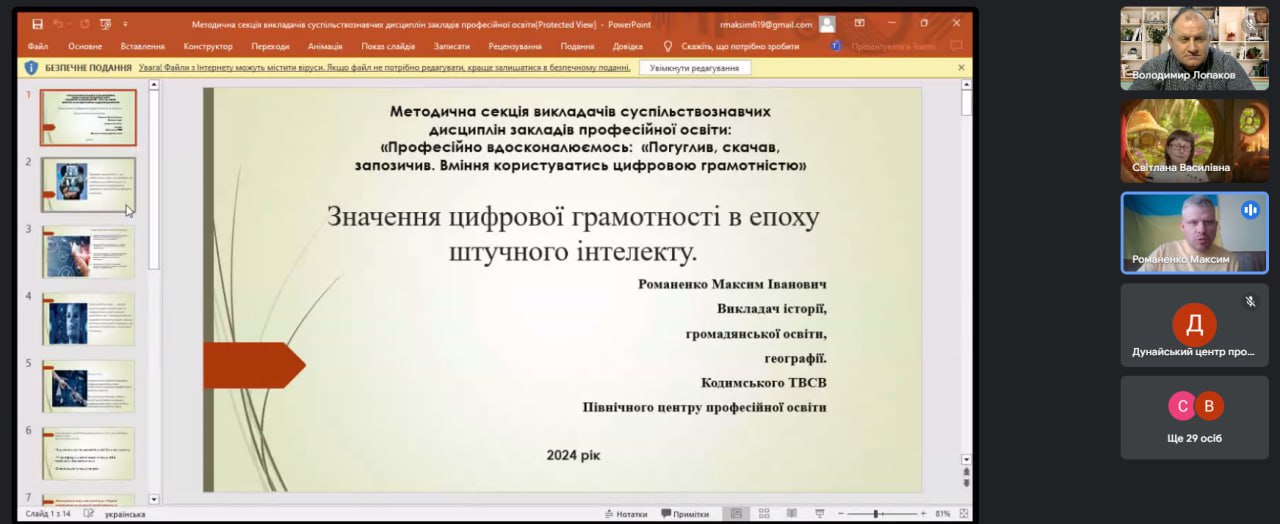 Розпочав засідання Романенко Максим Іванович, викладач історії, громадянської освіти, географії Кодимського ТВСВ Північного центру професійної освіти, який поділився досвідом про значення та використання цифрової грамотності в епоху штучного інтелекту.