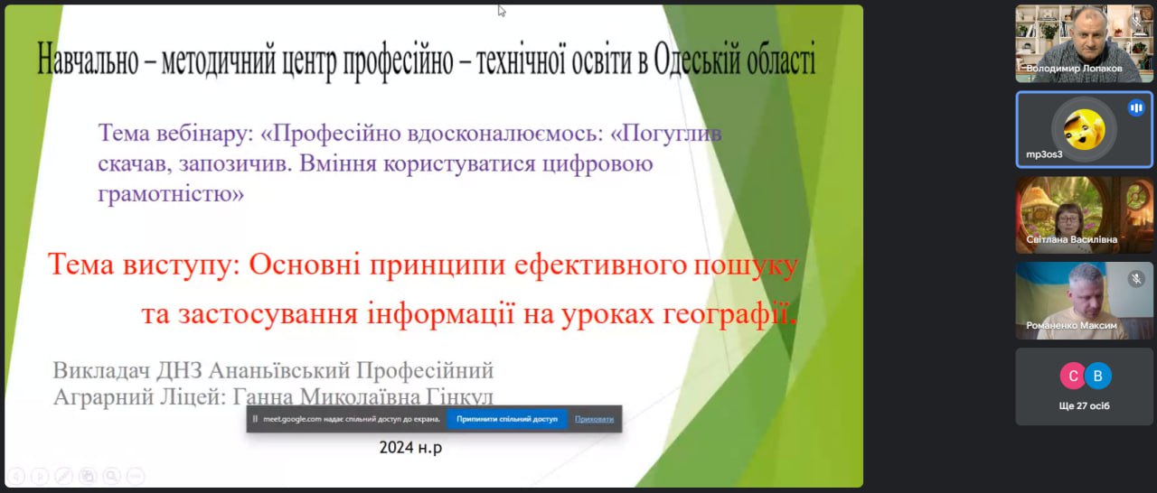 Продовжила роботу Гінкул Ганна Миколаївна, викладач історії, географії ДНЗ “Ананьївський професійний аграрний ліцей”. Вона продемонструвала на власному досвіді основні принципи ефективного пошуку та застосування інформації на уроках географії.