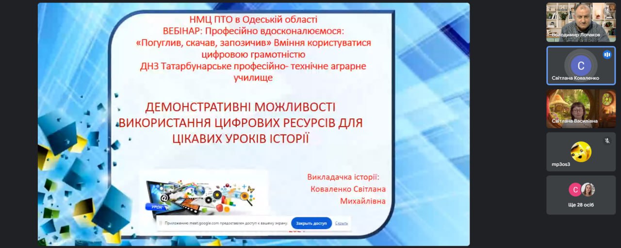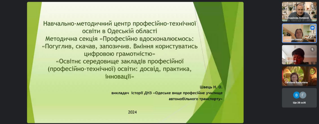 Відповідно до річного плану роботи НМЦ ПТО в Одеській області 29 березня відбулась онлайн-зустріч викладачів суспільствознавчих предметів закладів професійної (професійно-технічної) освіти на тему “Професійно вдосконалюємось: Погуглив, скачав, запозичив. Вміння користуватись цифровою грамотністю”.