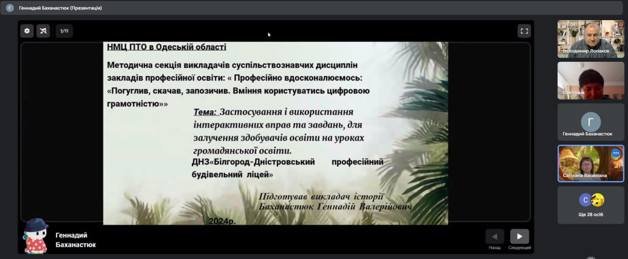 Про застосування і використання інтерактивних вправ та завдань, для залучення здобувачів освіти на уроках громадянської освіти продемонстрував Баханастюк Геннадій Валерійович, викладач історії, громадянської освіти ДНЗ “Білгород-Дністровський професійний будівельний ліцей”.