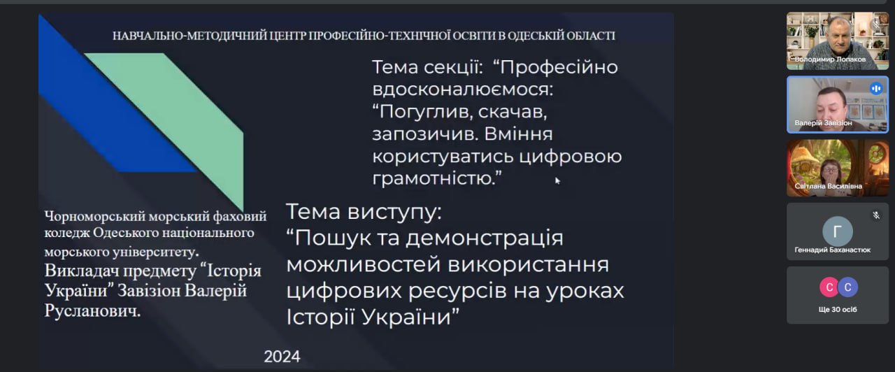 Щодо пошуку та демонстрації можливостей використання цифрових ресурсів на уроках історії України поінформував Завізіон Валерій Русланович, викладач історії “Чорноморський морський фаховий коледж ОНМУ”.