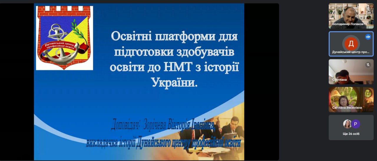 Висвітлила освітні платформи для підготовки здобувачів освіти до НМТ з історії України Вікторія Іванівна Зорічева, викладач історії “Дунайський центр професійної освіти”.