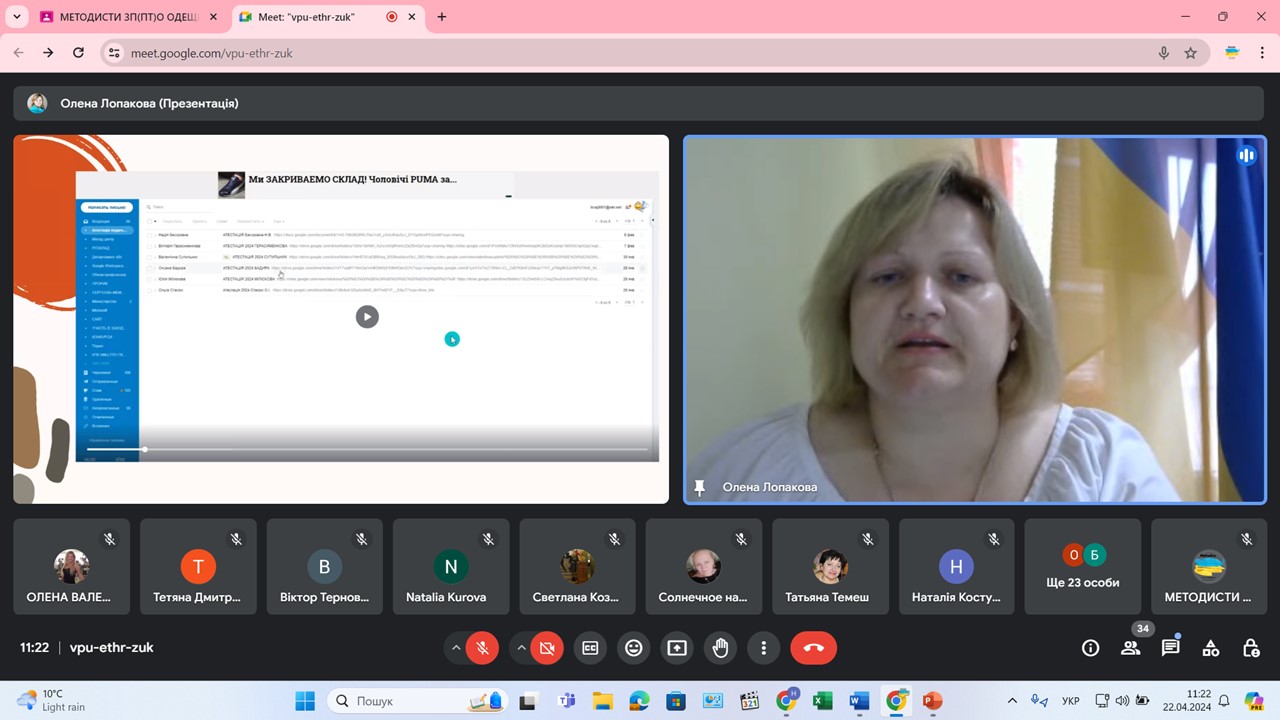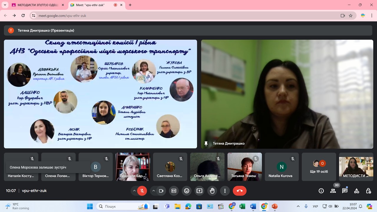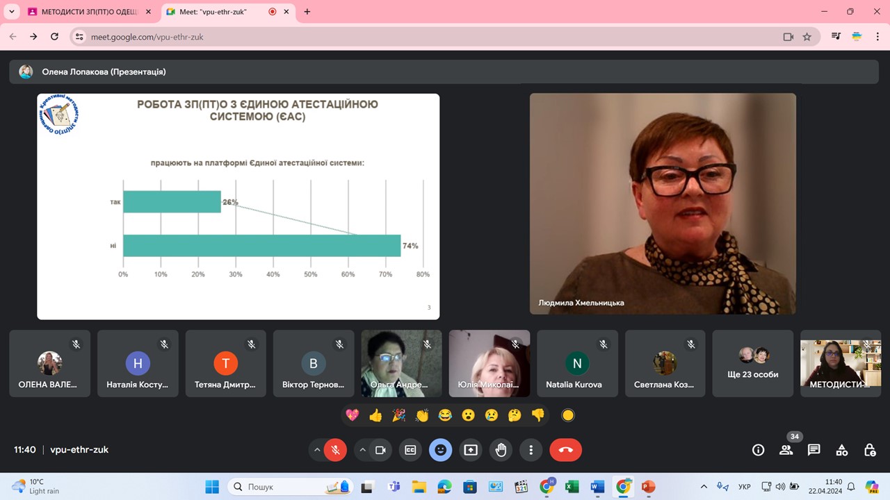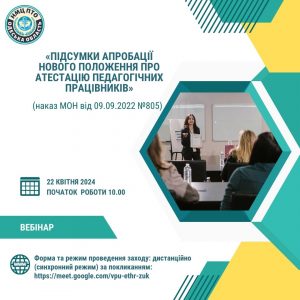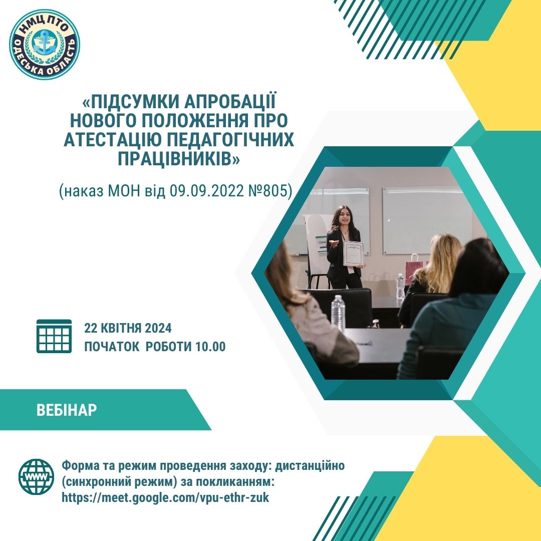 22 квітня 2024 року у формі вебінару відбулося засідання секції методистів закладів професійної (професійно-технічної) освіти Одеської області. Тема: «Підсумки апробації нового Положення про атестацію педагогічних працівників» (наказ МОН від 09.09.2022 №805).