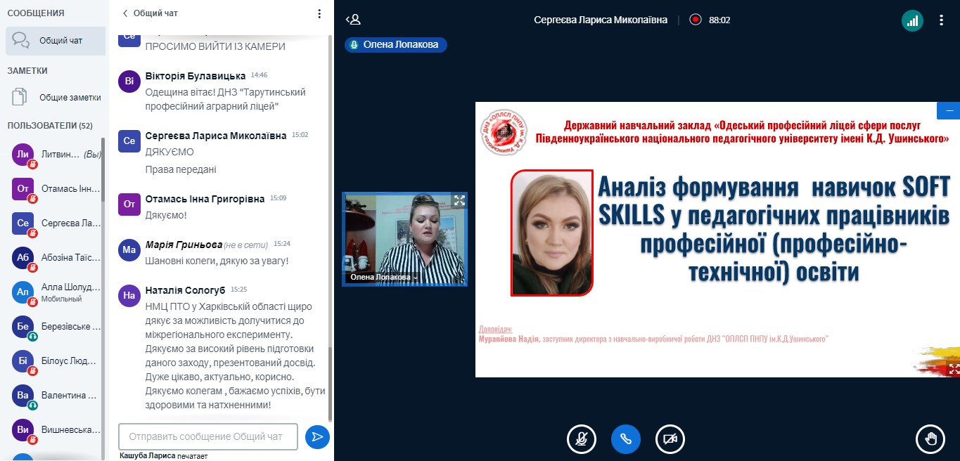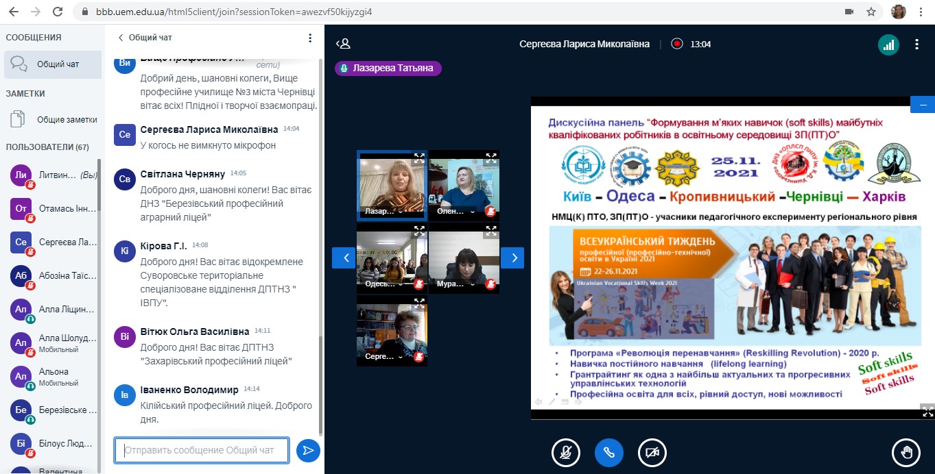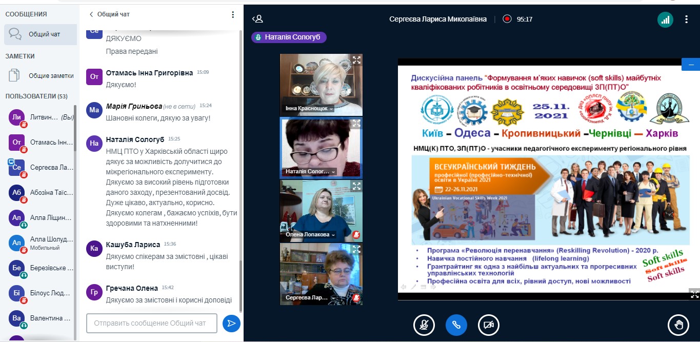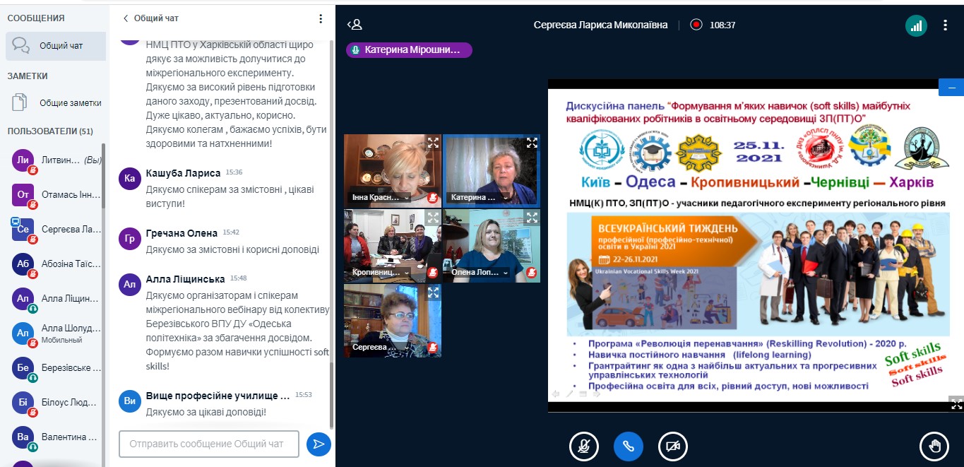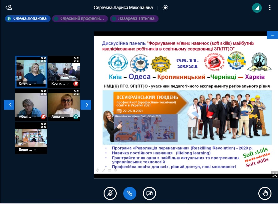 25 листопада 2021 року згідно плану заходів до Всеукраїнського тижня професійно-технічної освіти, в рамках експериментального педагогічного майданчика регіонального рівня відбувся міжрегіональний вебінар з теми “Формування м’яких навичок (soft skills) майбутніх кваліфікованих робітників в освітньому середовищі закладу професійної (професійно-технічної) освіти».