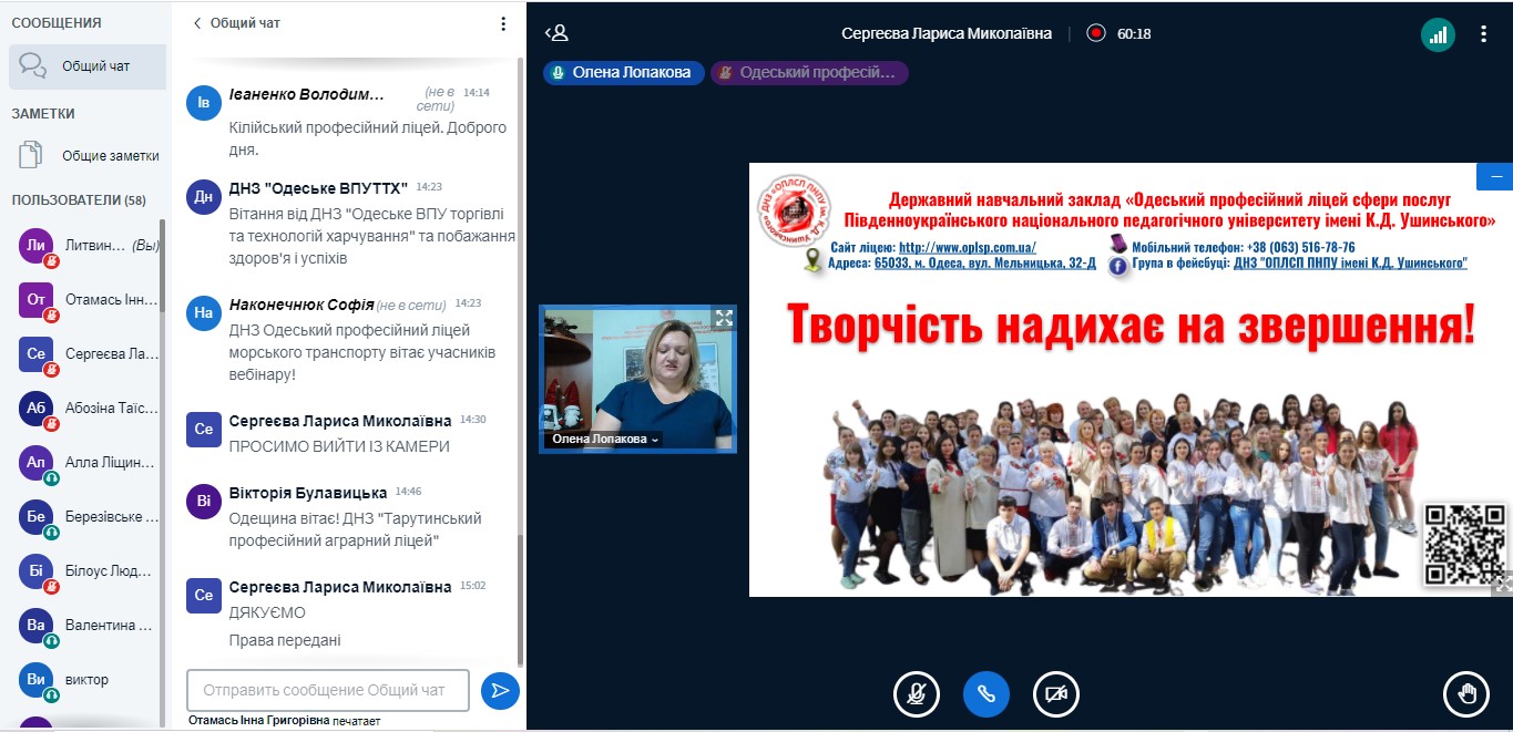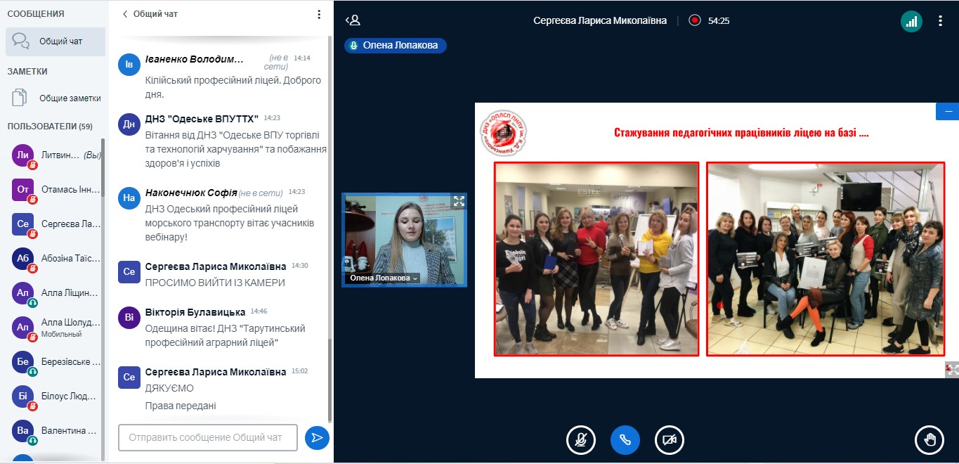 На заході були присутні Абозіна Таїса Михайлівна, заступник директора Департаменту освіти і науки Одеської обласної державної адміністрації, Муранова Наталія Петрівна, проректор з науково-педагогічної, освітньої роботи та міжнародних зв’язків ДЗВО «Університет менеджменту освіти» НАПН України, доктор педагогічних наук, професор, м. Київ, Микитюк Світлана Миколаївна, директор Навчально-методичного центру професійно-технічної освіти у Чернівецькій області, м. Чернівці, Шолудько Алла Петрівна, директор Навчально-методичного кабінету професійно-технічної освіти у Кіровоградській області, м. Кропивницький, Сологуб Наталія Григорівна, заступник директора Науково-методичного центру професійно-технічної освіти у Харківській області, м. Харків, Мірошниченко Катерина Борисівна, голова Громадської організації “Всеукраїнська асоціація працівників професійно-технічної світи”, м. Київ; Сергеєва Лариса Миколаївна – завідувач кафедри професійної і вищої освіти Центрального інституту післядипломної освіти ДЗВО «Університет менеджменту освіти» НАПН України, доктор педагогічних наук, професор, м. Київ; педагогічні працівники закладів професійної освіти Одеської області.