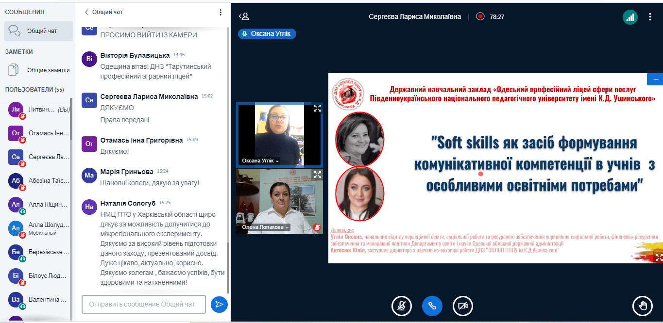 Soft skills як засіб формування комунікативної компетенції у здобувачів освіти з особливими освітніми потребами Антосюк Юлія Василівна, заступник директора з навчально-виховної роботи ДНЗ “ОПЛСП ПНПУ імені К.Д.Ушинського”, Углік Оксана Валентинівна, начальник відділу корекційної освіти, соціальної роботи та ресурсного забезпечення управління соціальної роботи, фінансово-ресурсного забезпечення та молодіжної політики Департаменту освіти і науки Одеської обласної державної адміністрації;
