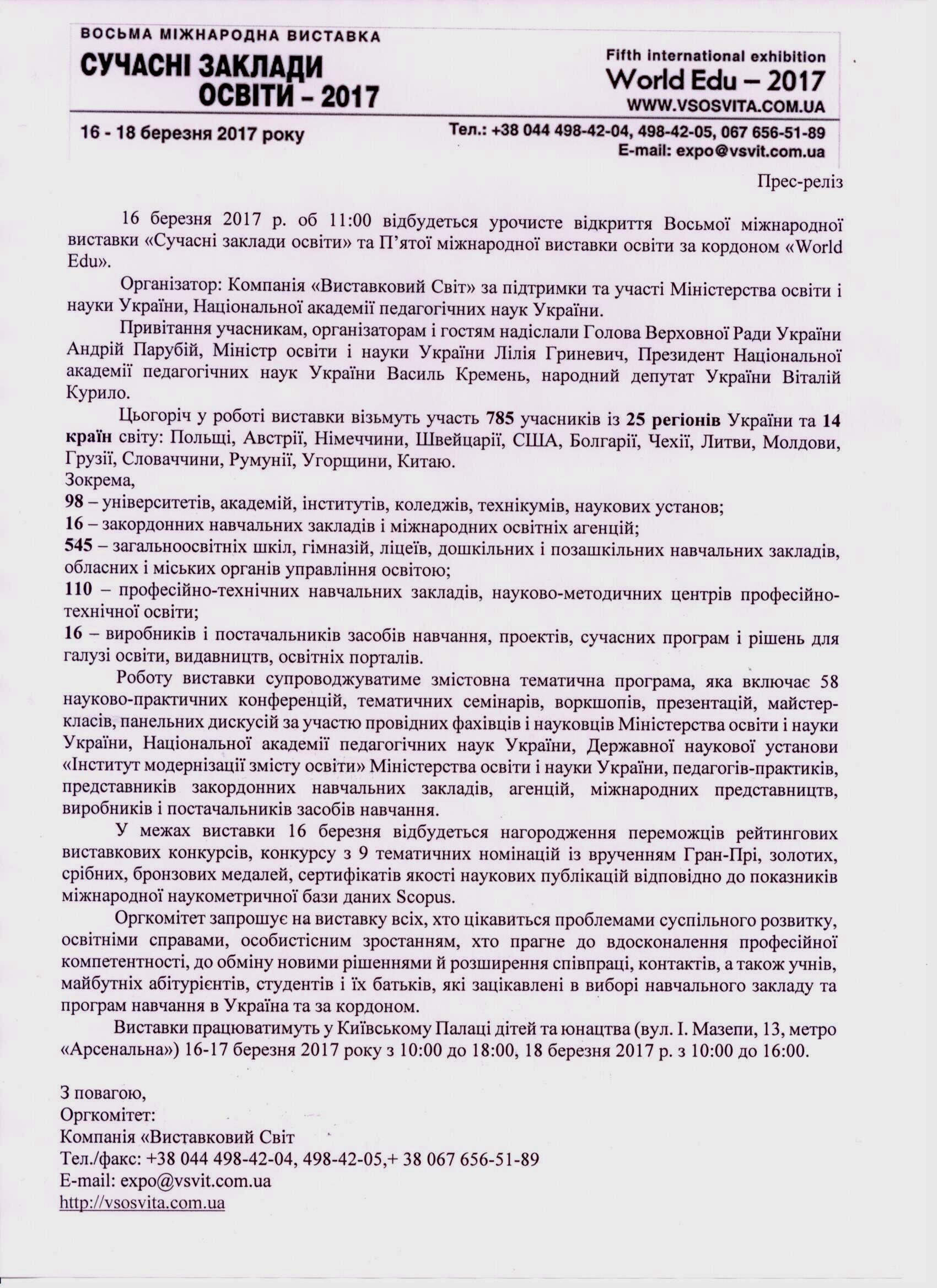 16-18 березня 2017 р. відбудеться Восьма міжнародна виставка «Сучасні заклади освіти» та П’ята міжнародна виставка освіти за кордоном «World Edu» у Київському Палаці дітей та юнацтва (вул. І. Мазепи, 13).