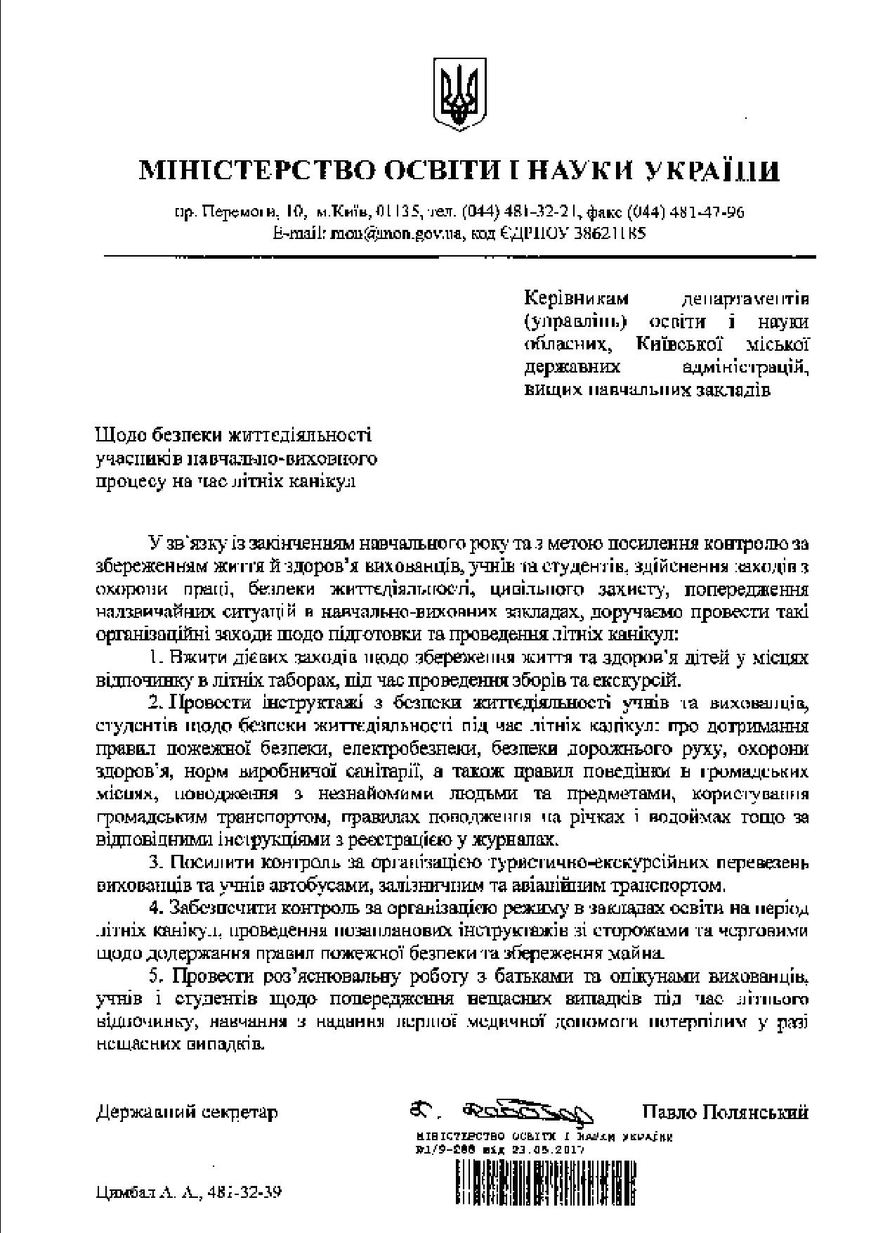 На виконання листа Міністерства освіти і науки України від 23.05.2017 №1/9-288 (додається) Навчально-методичний центр професійно-технічної освіти в Одеській області доручає розробити та провести організаційні заходи щодо безпеки життєдіяльності учасників навчально-виховного процесу на час літніх канікул.