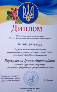 Журі конкурсу відзначило Верховську Ірину Анатоліївну за професійний рівень, ґрунтовні знання з предмету, досконалу методику його викладання та організації навчально-виховного процесу, уміння налагоджувати контакт із здобувачами освіти, спрямовувати їх діяльність на практичне засвоєння програмового матеріалу.