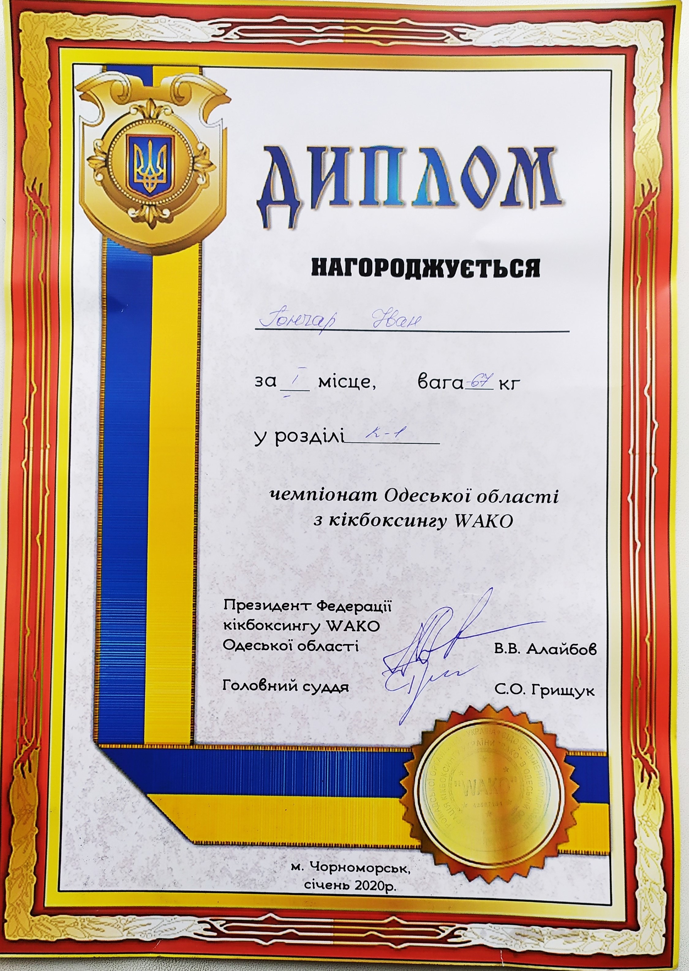 Навчально- методичний центр професійно – технічної освіти в Одеській області вітає Гончара Івана, учня ДНЗ «Одеський професійний ліцей морського транспорту» з почесною перемого – І місце в чемпіонаті Одеської області з кікбоксингу WAKO.