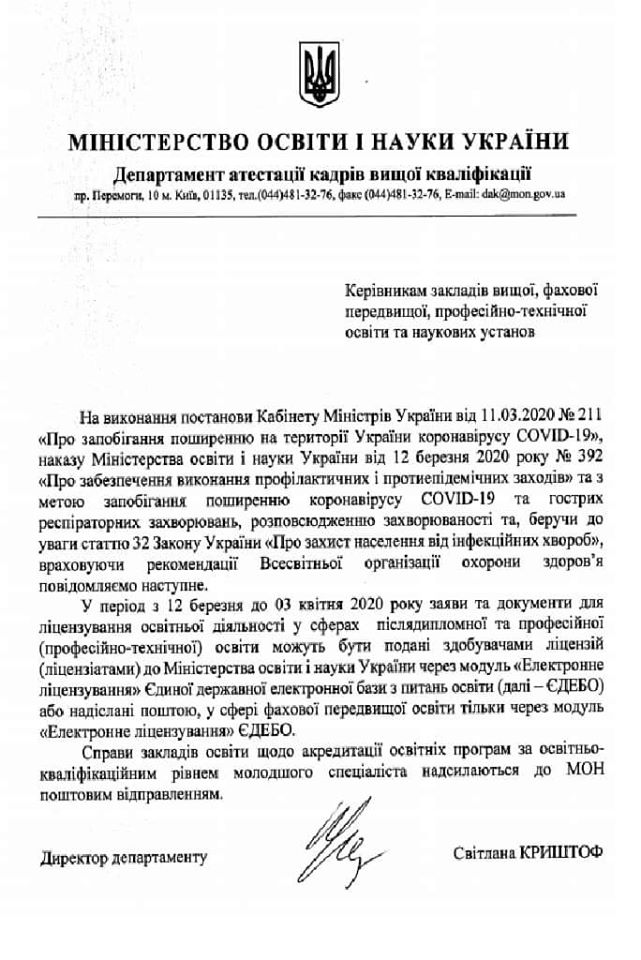 Лист Департаменту атестації кадрів вищої освіти щодо подачі здобувачами ліцензій заяв та документів для ліцензування освітньої діяльності у сферах післядипломної та професійної (професійно-технічної) освіти.