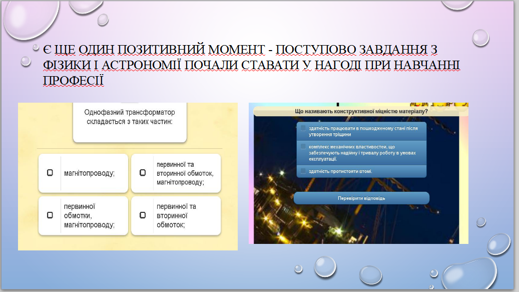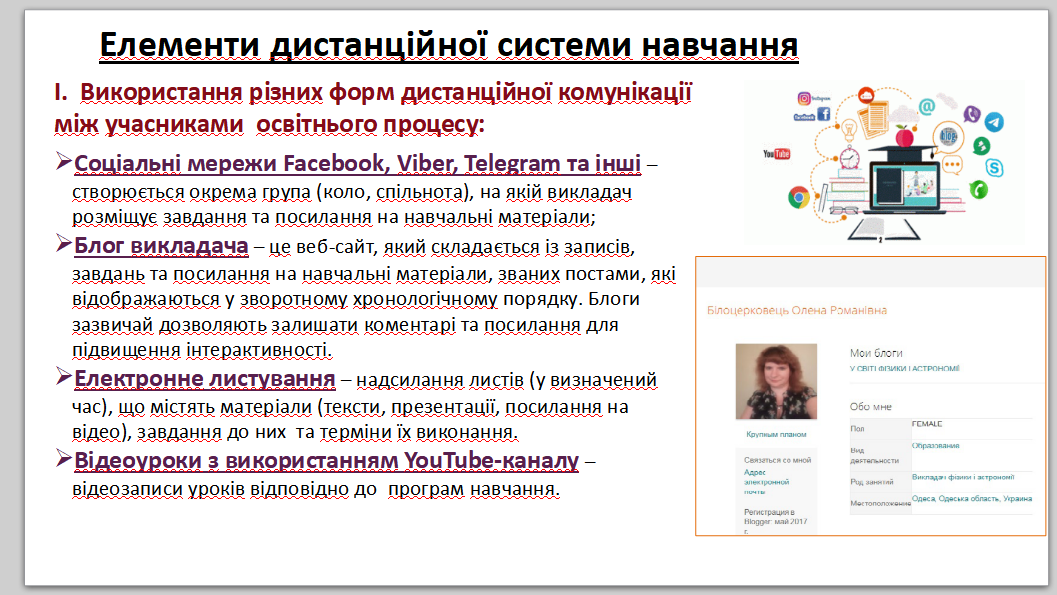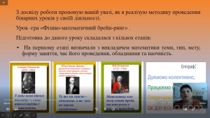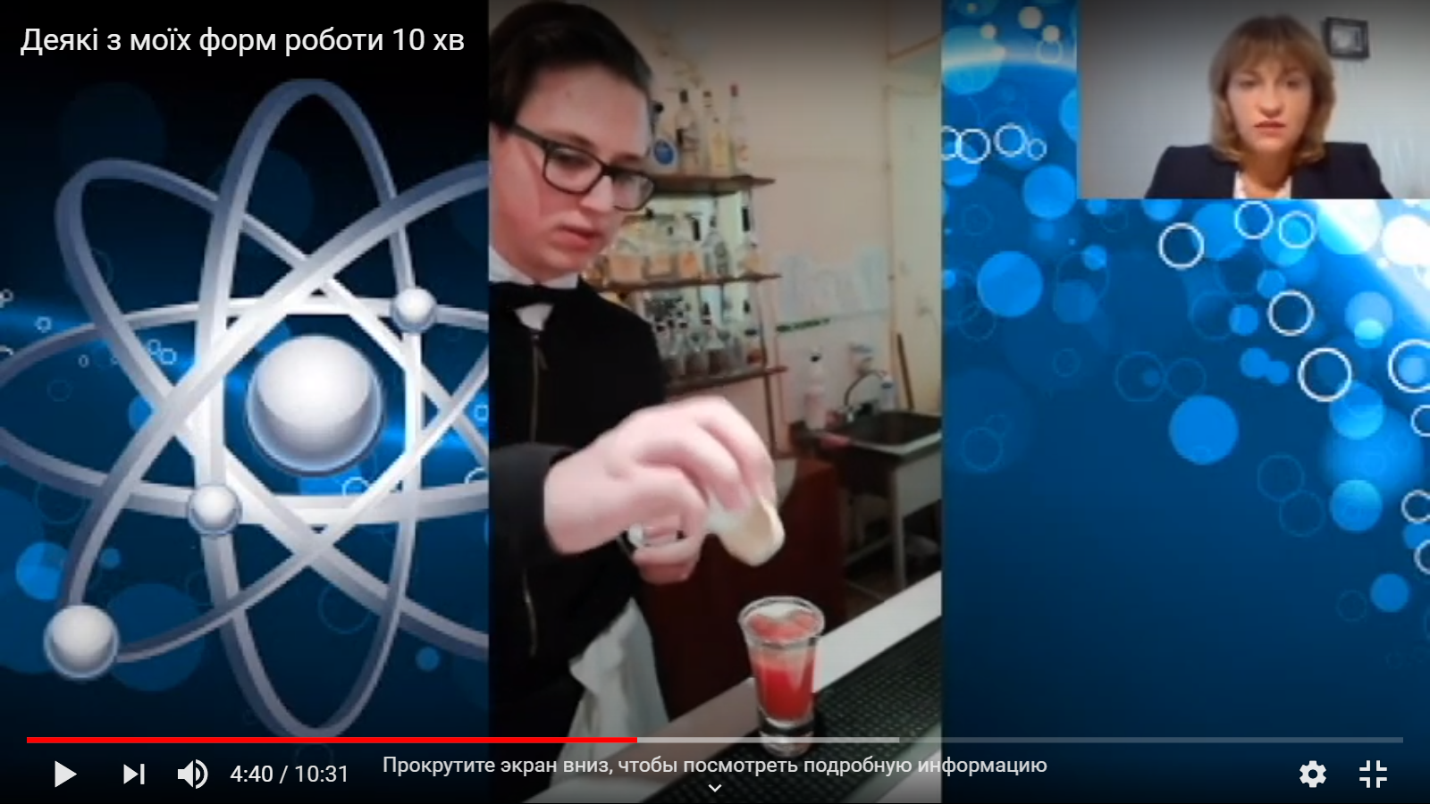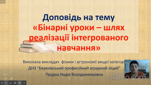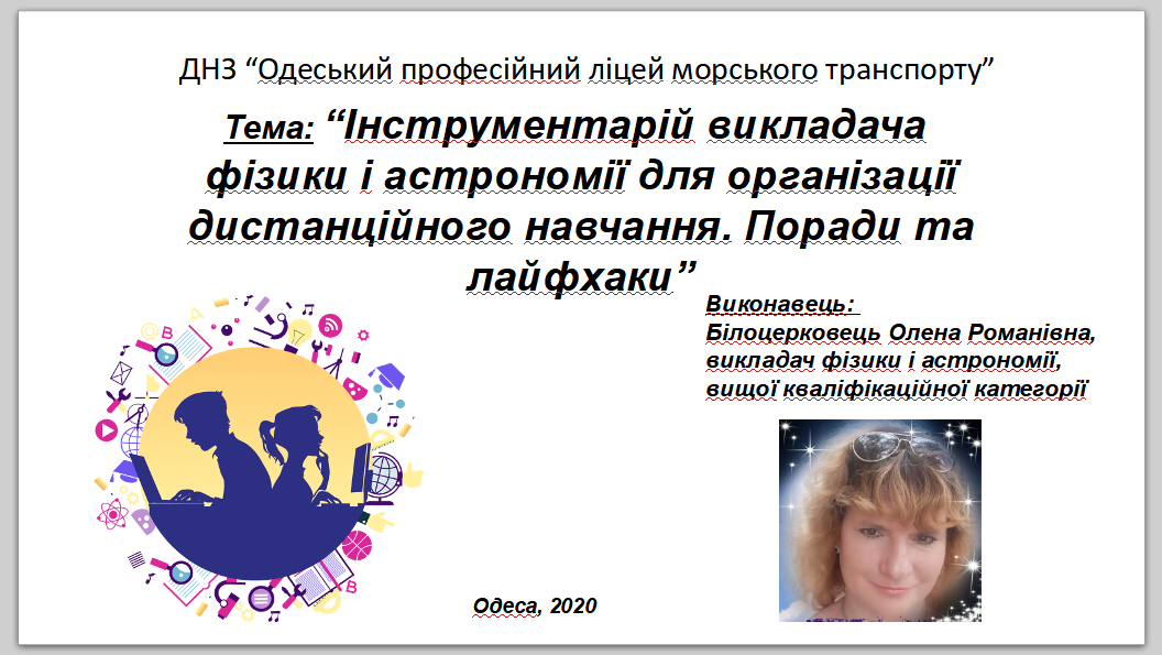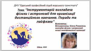 Викладачі ділилися власним досвідом, зокрема: Прудка Н.В., викладач фізики і асторономії ДНЗ «Березівський професійний аграрний ліцей» презентувала досвід проведення нетрадиційних (бінарних) уроків з фізики і астрономії як засобу розвитку пізнавального інтересу здобувачів освіти; Макаріна В.В., викладач фізики і асторономії Чорноморського морського коледжу Одеського національного морського університету доповіла про досвід використання на уроках фізики власних учнівських відеофрагментів, як засобу активізації навчального процесу та розвитку ключових компетентностей здобувачів освіти; Чернєва В.Е., викладач фізики і асторономії ДНЗ «Білгород-Дністровський професійний будівельний ліцей» поділилася результатом дворічного впровадження в навчальний процес технології LearningApps з метою підвищення якості освіти з фізики; Білоцерковець О.Р., викладач фізики і астрономії ДНЗ «Одеський професійний ліцей морського транспорту» запропонувала колегам інструментарій викладача щодо організації дистанційного навчання та поділилася власним досвідом організації та проведення такого навчання; про проектну технологію як універсальний метод для виховання компетентнісного здобувача освіти доповіла Рудянчук Г.І., викладач біології і екології ДНЗ «Одеський центр професійно-технічної освіти». Досвідом формування екологічної компетентності здобувачів освіти поділилася Биковська В.О., викладач хімії та біології і екології ДНЗ «Білгород-Дністровський професійний будівельний ліцей». Всі доповідачі підготували презентації.