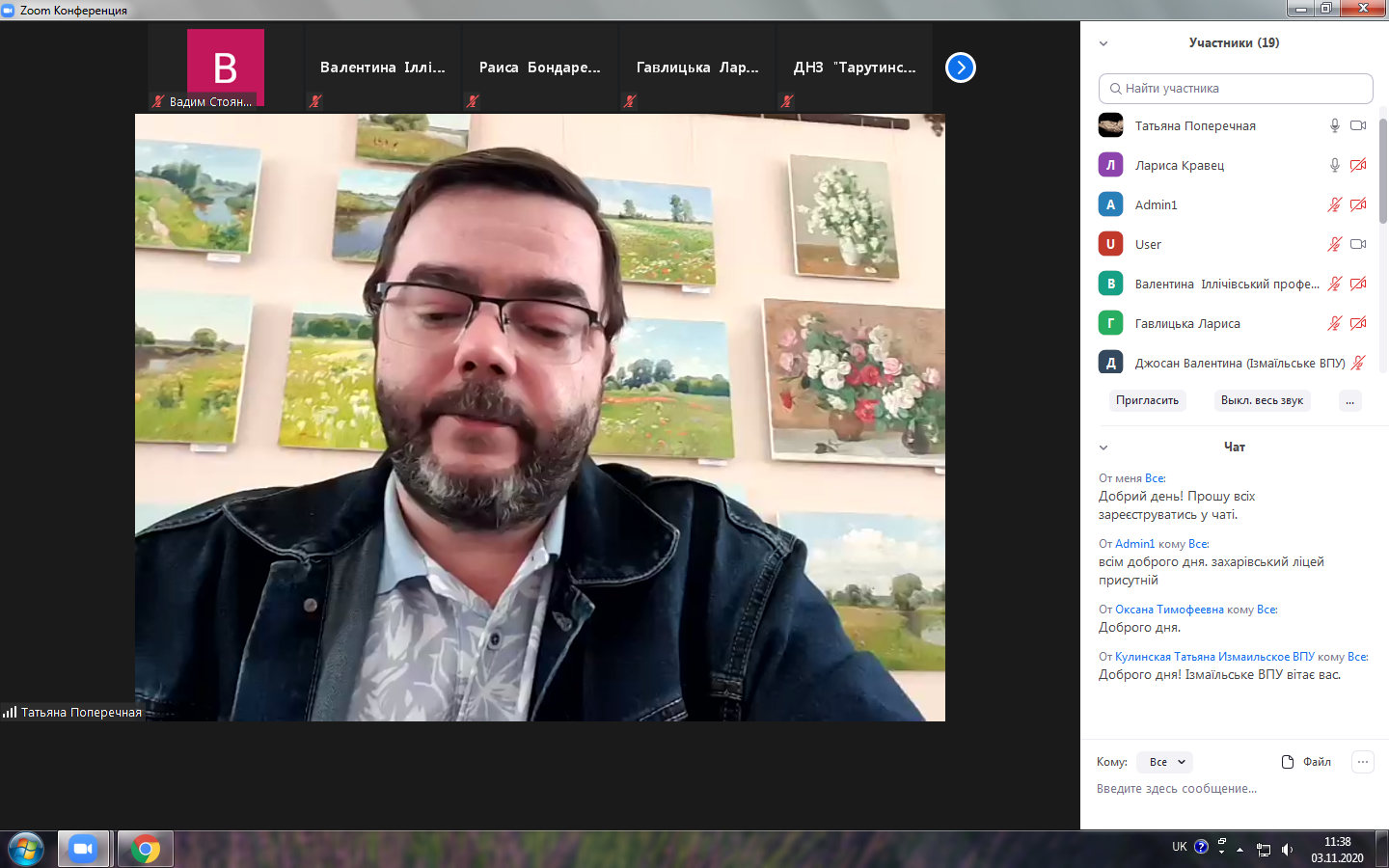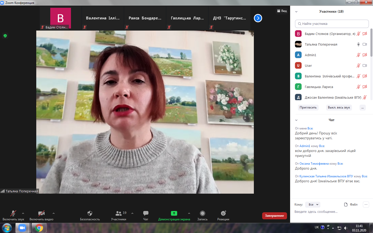 Відкрив роботу вебінару та привітав учасників Стоянов В.С., методист НМЦ ПТО в Одеській області. Про нові форми дистаційної роботи в бібліотеці розповіла Дементьєва С.А., завідувачка методичного відділу Центральної міської бібліотеки ім. І.Я. Франка. Поперечна Т.А., завідувачка читальної зали Центральної міської бібліотеки ім. І.Я. Франка, закцентувала увагу на сучасних викликах самоосвіти бібліотекаря. Питання щодо протидії булінгу та кібербулінгу за допомогою бібліотеки розкрила Бутт Н.В., методист Центральної міської бібліотеки ім. І.Я. Франка. Про інструменти мультимедійного інформування користувачів бібліотеки проінформував учасників вебінару Кисельов О.В., бібліотекар Центральної міської бібліотеки ім. І.Я. Франка. Гурова Л.О., завідувачка книгосховища Центральної міської бібліотеки ім. І.Я. Франка, ознайомила аудиторію із проблемами та щляхами їх вирішення при переведенні бібліотечних фондів на УДК.