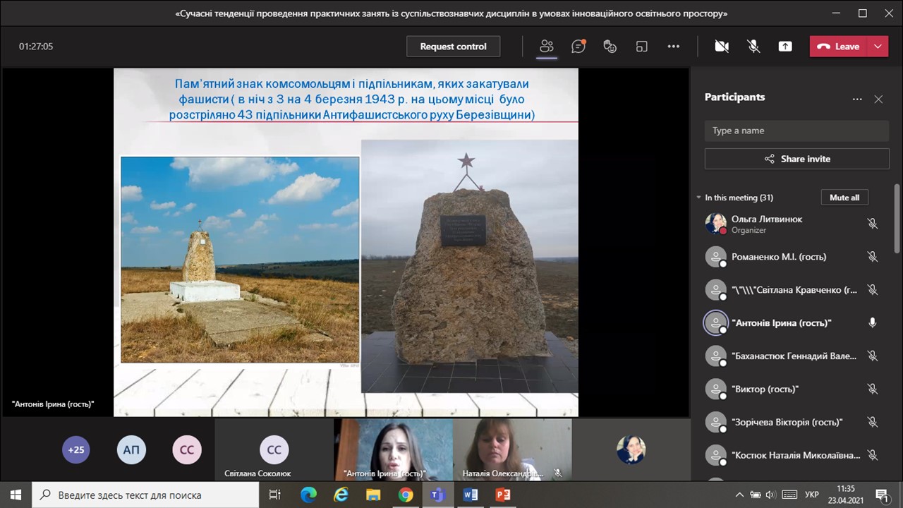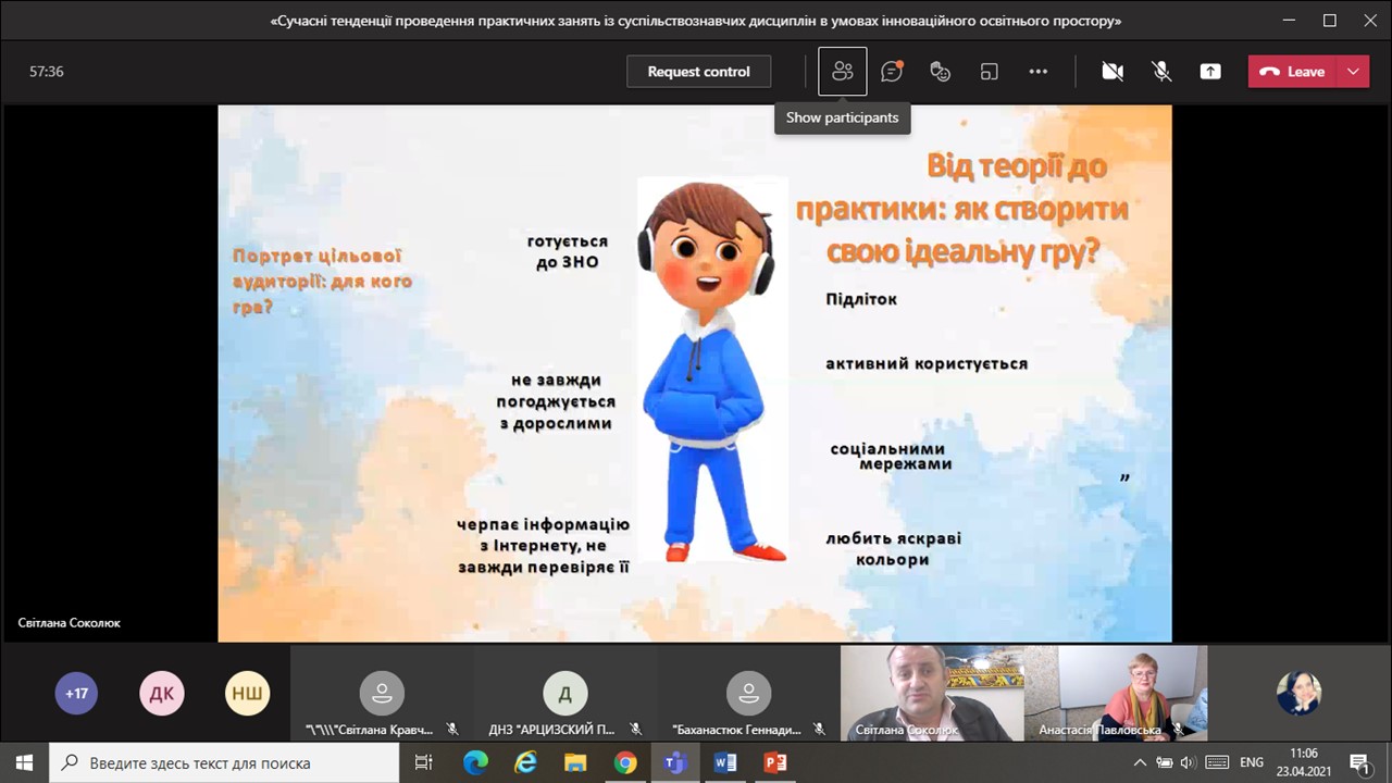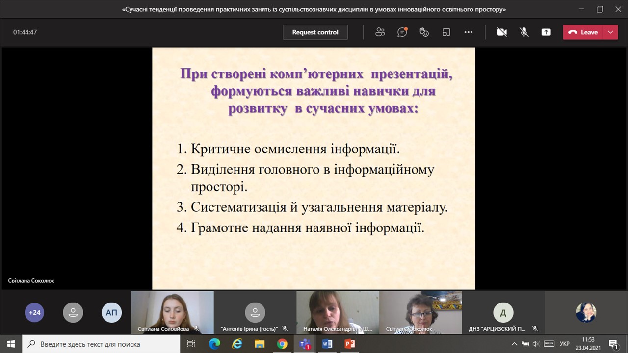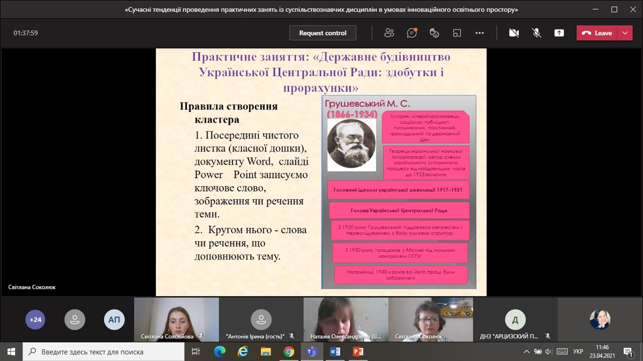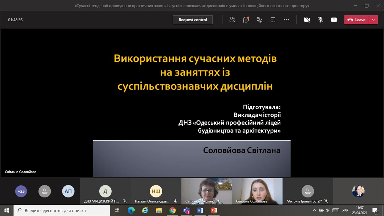 Зважаючи на це, 23 квітня 2021 року Навчально-методичним центром професійно-технічної освіти в Одеській області було проведено онлайн-семінар викладачів суспільствознавчих дисциплін з проблеми «Сучасні тенденції проведення практичних занять із суспільствознавчих дисциплін в умовах інноваційного освітнього простору».