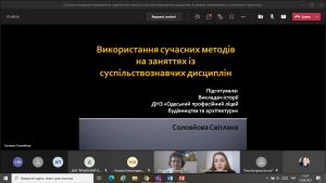 Про використання сучасних методик на заняттях суспільствознавчих дисциплін розповіла Соловйова Світлана Сергіївна – викладач історії ДНЗ «Одеський професійний ліцей будівництва та архітектури».