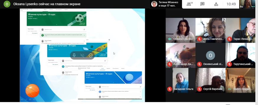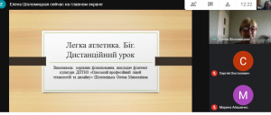 На онайн-зсіданні викладачі ділились досвідом викладання фізичної культури під час дистанційного навчання. Так про особливості викладання фізичної культури при змішаній формі навчання доповіла Шоломицька Олена Миколаївна, ДПТНЗ «ОПЛТД». Нею підготовлена корисна презентація «Приклад дистанційного уроку «Легка атлетика. Біг».