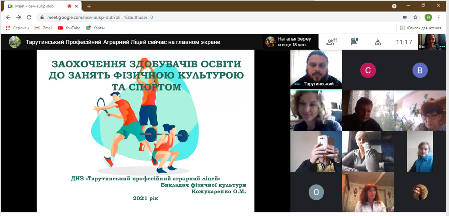 31 травня 2021 року пройшло онлайн-засідання обласної методичної секції викладачів предмету «Фізична культура» закладів професійної освіти. Онлайн-засідання проводилось за допомогою сервісу відеотелефонного зв’язку Google Meet. Тема: “Інновації тіловиховання”: робимо уроки фізичної культури цікавішими”. Відкрила онлайн-засідання, привітала учасників, ознайомила з планом роботи Хван Наталія Бен-Себівна, методист НМЦПТО в Одеській області.