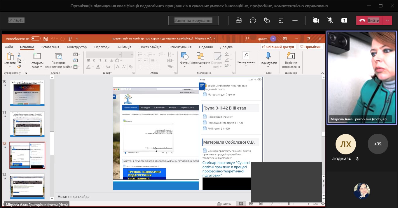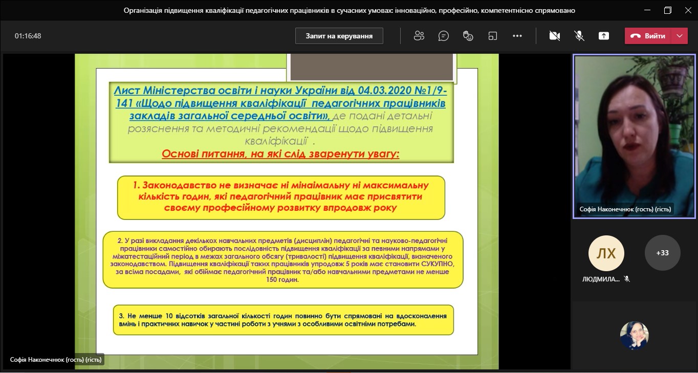 До уваги учасників онлайн – семінару були запропоновані змістовні презентації з актуальних питань щодо організації підвищення кваліфікації педагогічних працівників в сучасних умовах.