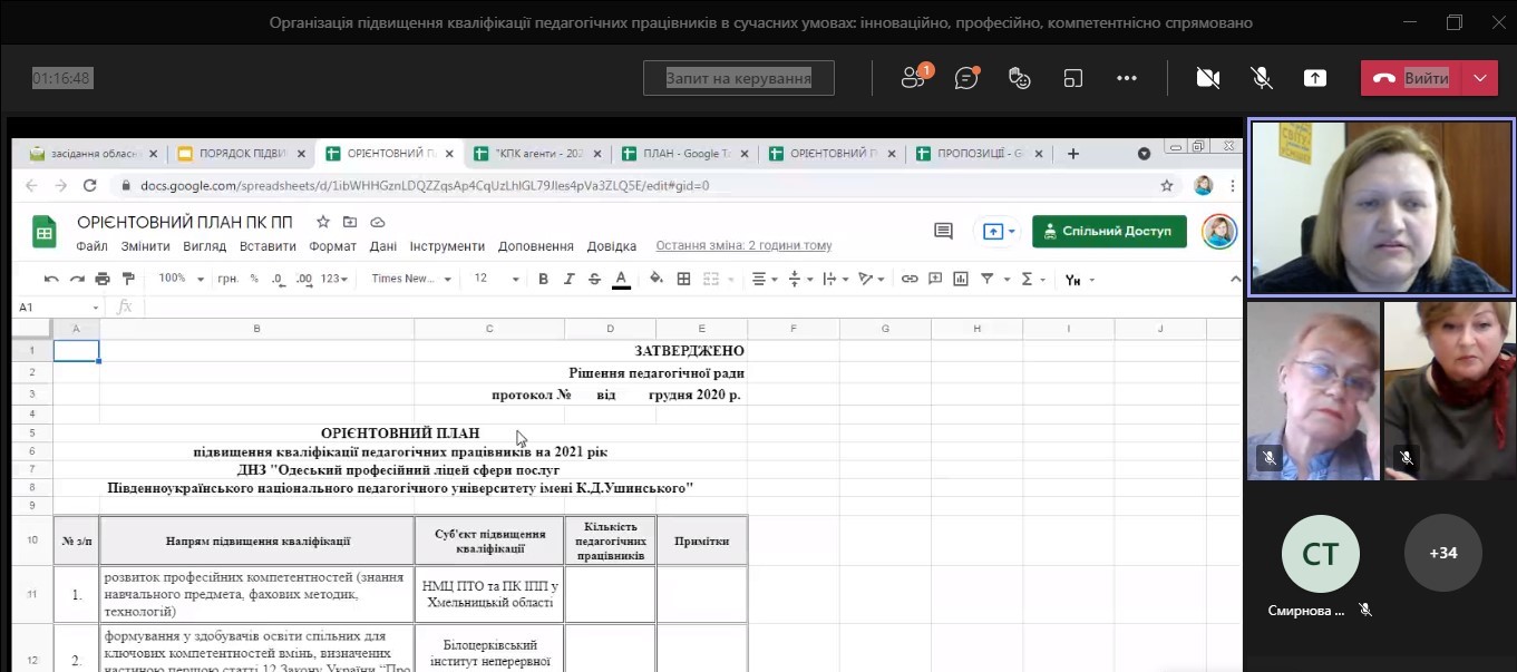Методист Навчально-методичного центру ПТО в Одеській області Людмила Хмельницька ознайомила учасників заходу з базовими ключовими аспектами організації підвищення кваліфікації педпрацівників відповідно до вимог нормативної документації у презентації на тему «Професійний розвиток педагога: нові можливості, основні зміни, порядок дій».