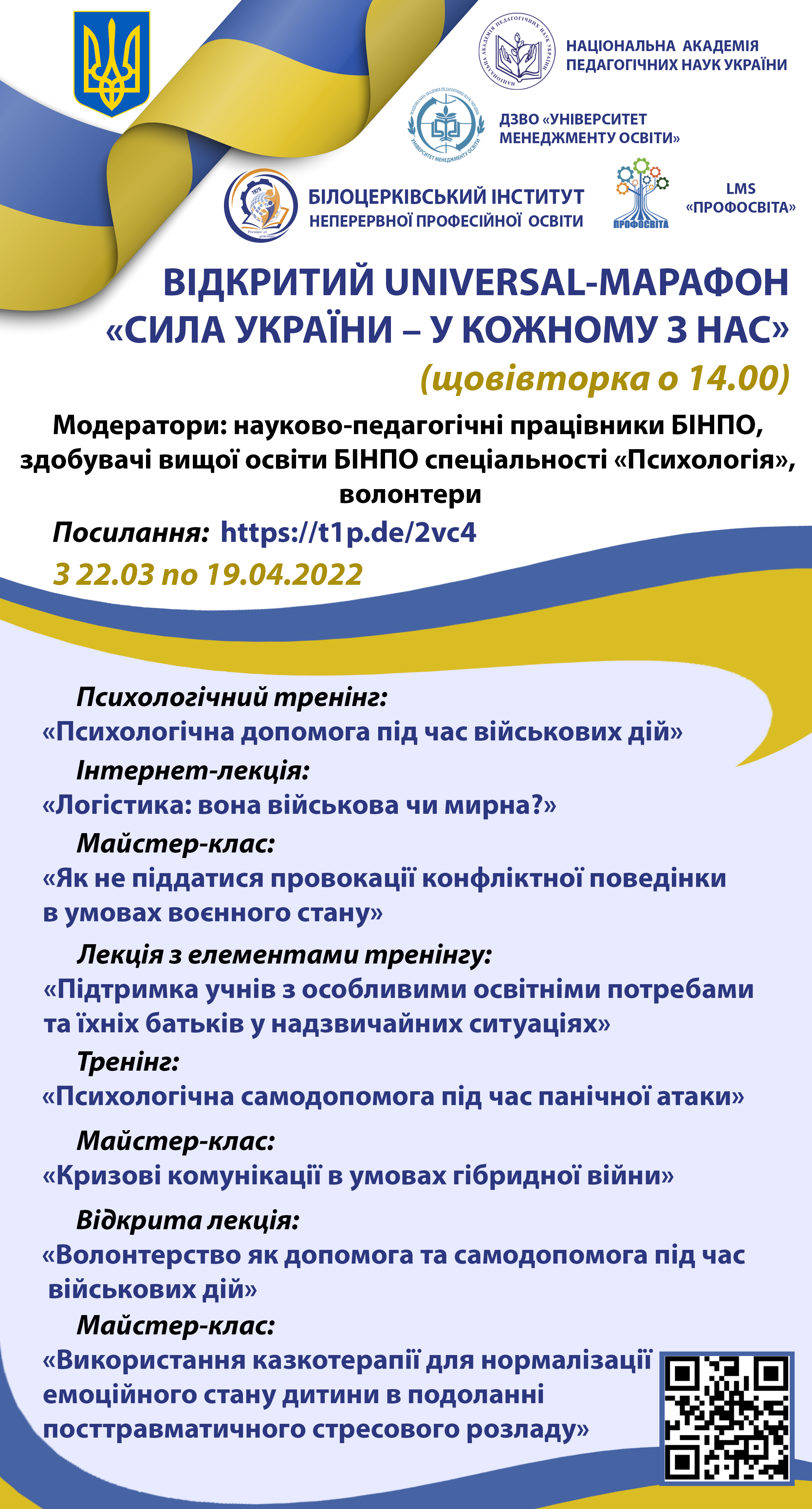 Білоцерківський інститут неперервної професійної освіти ДЗВО «УМО» НАПН України запрошує Вас долучитись до заходів, які відбуватимуться впродовж березня – квітня 2022 року. (ЛИСТ )