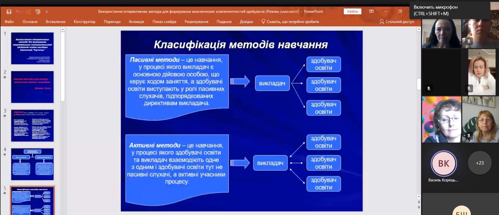 Гриценко Світлана Андріівна, голова обласної методичної секції викладачів іноземних мов, викладач іноземної мови ДНЗ «Одеський професійний ліцей морського транспорту», поінформувала про організацію освітнього процесу в закладах П (ПТ)О в умовах правового режиму воєнного стану.