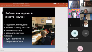 Розпочала роботу онлайн-вебінару Лягун Ольга Михайлівна, викладач іноземної мови ДНЗ «Білгород-Дністровський професійний будівельний ліцей» представивши презентацію «Що таке Коучинг, його можливості та використання на уроках іноземної мови»;
