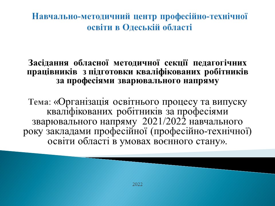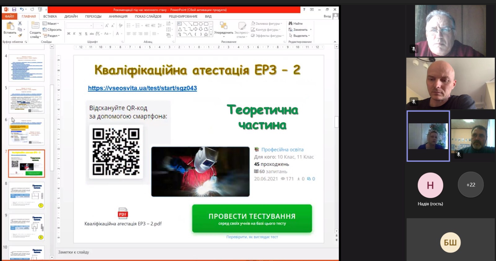 Засідання проводилось у формі вебінару (онлайн) на тему: «Організація освітнього процесу та випуску кваліфікованих робітників за професіями зварювального напряму 2021/2022 навчального року закладами професійної (професійно-технічної) освіти області в умовах воєнного стану».