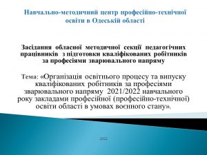 Згідно з планом роботи НМЦ ПТО в Одеській області 28 квітня 2022р. на платформі Microsoft Teams відбулося засідання обласної методичної секції педагогічних працівників закладів професійної освіти, які забезпечують підготовку кваліфікованих робітників за професіями: «Електрогазозварник», «Електрогазозварник судновий», «Зварник», «Електрозварник ручного зварювання», «Електрозварник на автоматичних та напівавтоматичних машинах», «Контролер зварювальних робіт».