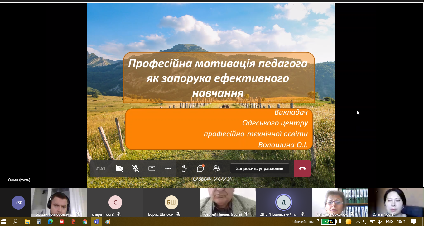 12 травня 2022 року навчально-методичним центром професійно-технічної освіти в Одеській області було проведено онлайн-вебінар викладачів суспільствознавчих дисциплін. Тема онлайн – вебінару «Мотиваційні ключі педагога під час викладання суспільствознавчих дисциплін».