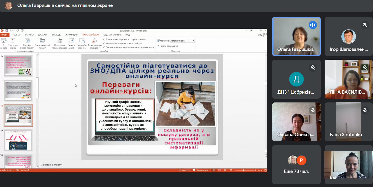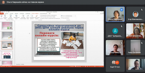 Значну увагу викладачі приділили підготовці здобувачів освіти до ДПА та ЗНО в умовах дистанційного навчання. Зокрема Башкатова Євгенія Володимирівна, викладач інформатики та математики, ДНЗ ОЦПТО, презентувала досвід роботи підготовки здобувачів освіти до ДПА та ЗНО під час дистанційного навчання.