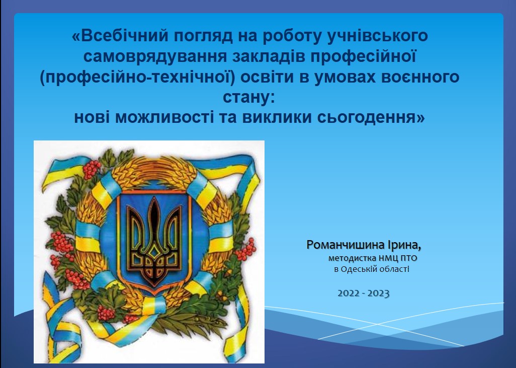 Питання про «Всебічний погляд на роботу учнівського самоврядування закладів професійної (професійно-технічної) освіти в умовах воєнного стану: нові можливості та виклики сьогодення» висвітлила Романчишина І.В. методистка кабінету організаційно-методичної, кадрової та виховної роботи НМЦ ПТО в Одеській області.