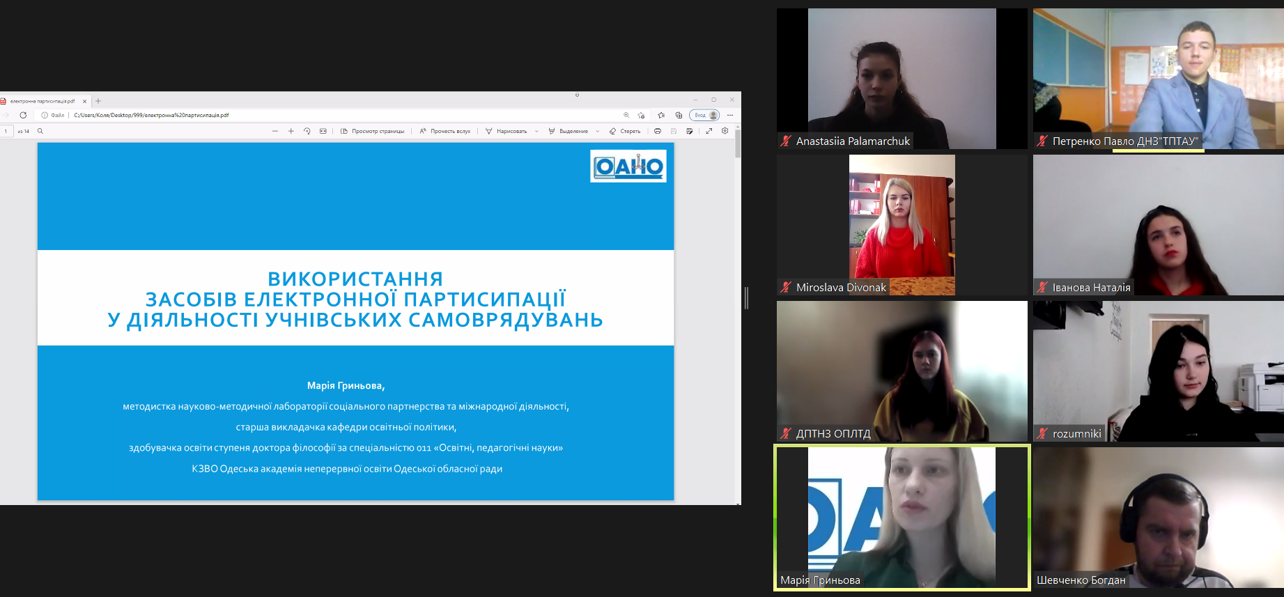 Відкрила форум з елементами моніторингу на тему: «Використання засобів електронної партисипації у діяльності самоврядування» – Гриньова М.В., методист науково-методичної лабораторії соціального партнерства та міжнародної діяльності, викладач кафедри освітньої політики, координаторка Одеської обласної школи громадянської партиспації дорослих та молоді «УСі В ДІЇ!», КЗВО «Одеська академія неперервної освіти Одеської обласної ради».