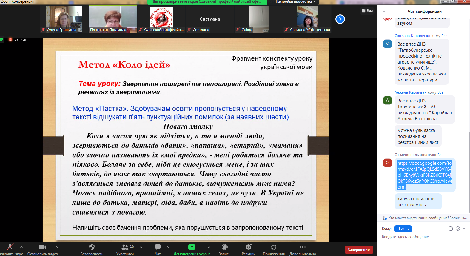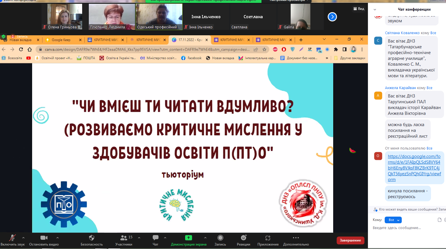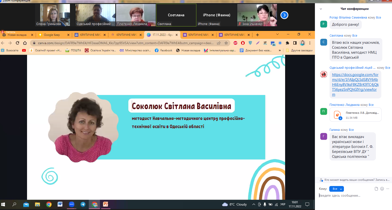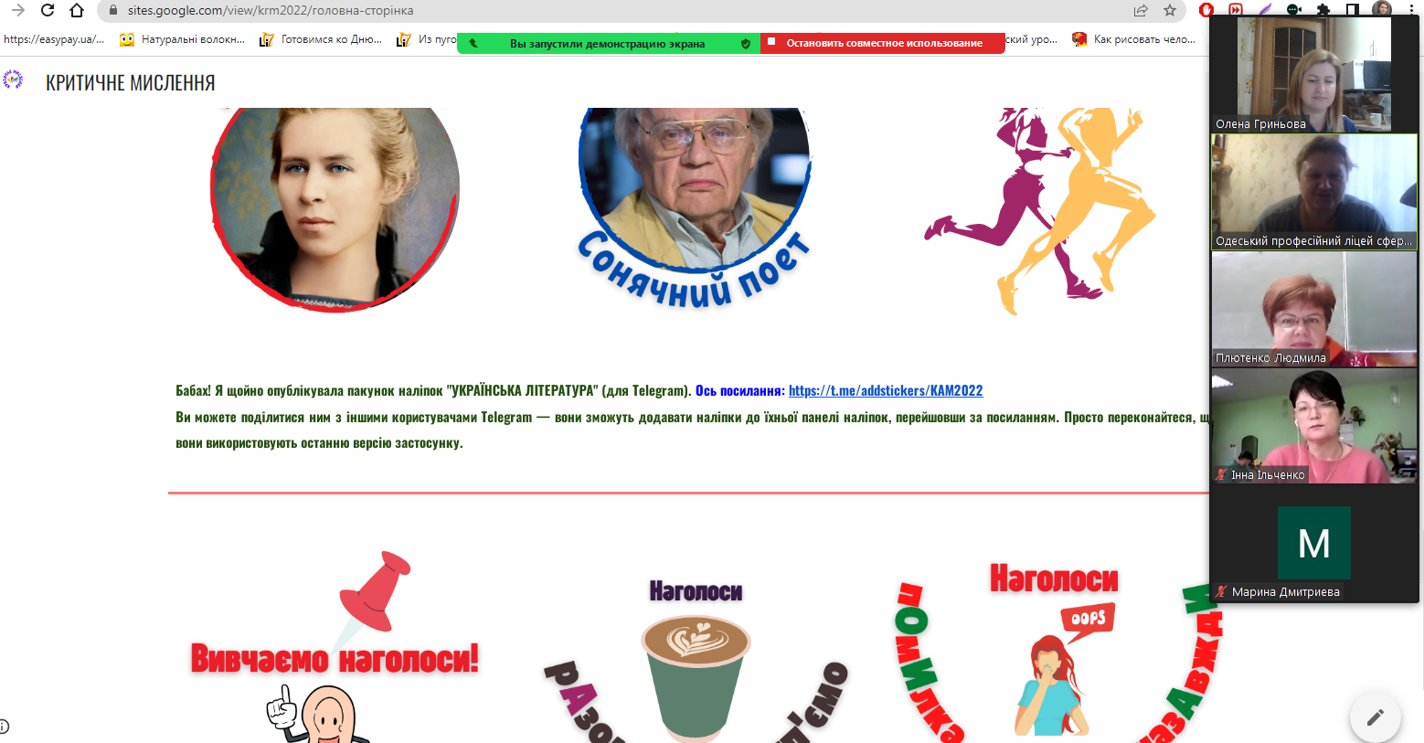 17 листопала 2022 року Навчально-методичним центром професійно-технічної освіти в Одеській області було проведено секцію у формі онлайн -практикуму викладачів словесності на тему «Розвиток критичного мислення на уроках української мови, зарубіжної та української літератури».