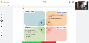 Поділились досвідом, як на практиці використовують інтерактивні методи для розвитку критичного мислення Лопакова Олена Миколаївна-викладач української мови ДНЗ ОПЛСП ПНПУ ім. К.Д.Ушинського та Гриньова Олена Григорівна-викладач української мови та літератури ДНЗ ОПЛСП ПНПУ ім К.Д.Ушинського. Вони разом з учасниками заходу, провели тьюторіум – практикум, під час якого застосували методи розвитку критичного мислення, а саме: сучасні платформи – інтерактивні дошки (linoit, padlet, gamboard); wordwall, mentimeter. Обговорили за допомогою методу СВОТ-аналіз позитивні та негативні сторони впровадження методики розвитку критичного мислення. Всім учасникам тьюторіуму, модератори презентували подарунки – розроблені наліпки з української мови та літератури для взаємозв’язку із здобувачами освіти у Telegram.