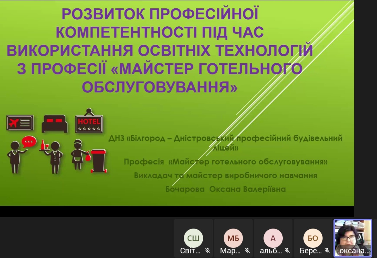 Підготовку кваліфікованих робітників за професією «Майстер готельного обслуговування» в області здійснює один навчальний заклад – ДНЗ «Білгород-Дністровський професійний будівельний ліцей. Тому всім було цікаво послухати та подивитись презентацію на тему «Розвиток професійної компетентності під час використання освітніх технологій з професії «Майстер готельного обслуговування» Бочарової Оксани Валеріївни, викладача спецдисциплін, майстра виробничого навчання цього закладу.