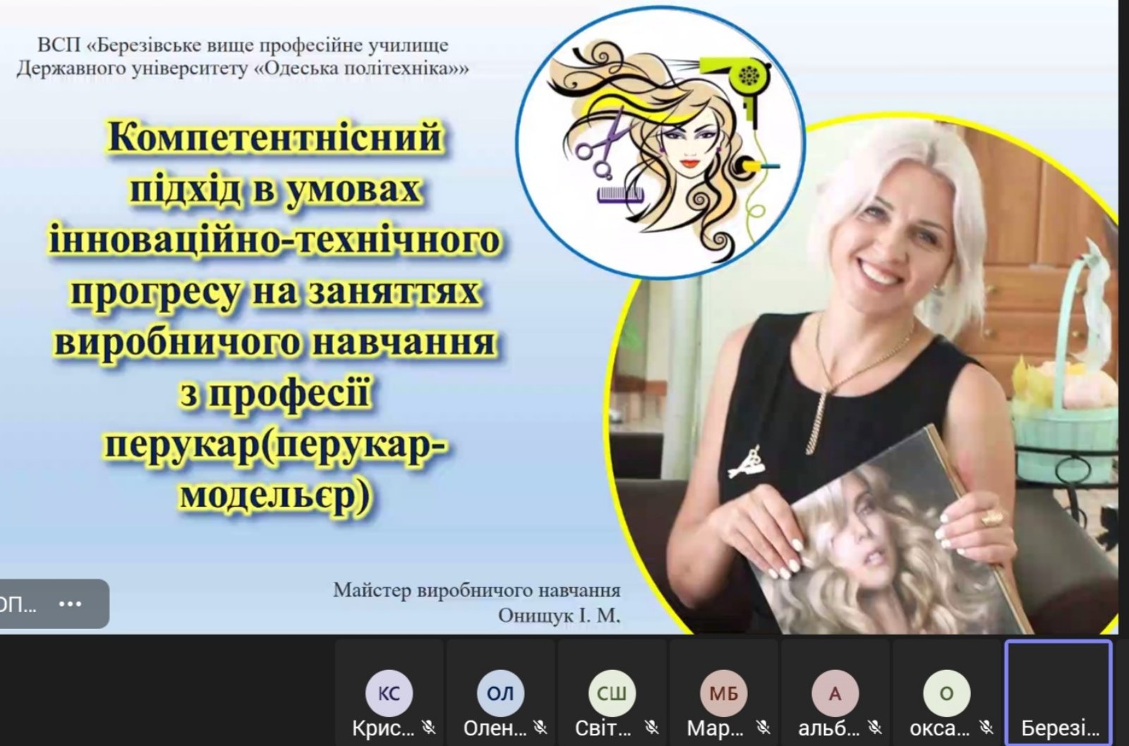 Наглядно представила у своїй доповіді Онищук Інна Миколаївна, викладач спецдисциплін, майстер виробничого навчання ВСП «Березівське вище професійне училище Державного університету «Одеська політехніка», як компетентнісний підхід в умовах інноваційно-технічного прогресу на заняттях виробничого навчання з професії «Перукар (перукар-модельєр» впливає на якість підготовки кваліфікованих робітників.