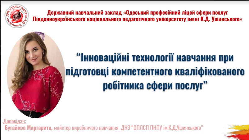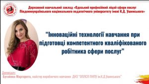 Бугайова Маргарита Володимирівна, майстер виробничого навчання ДНЗ «Одеський професійний ліцей сфери послуг Південноукраїнського національного педагогічного університету імені К.Д.Ушинського» виступила з дуже цікавою презентацією на тему: «Інноваційні технології навчання при підготовці компетентного кваліфікованого робітника сфери послуг». Вона розповіла про творчі здобутки здобувачів освіти та педагогів навчального закладу.